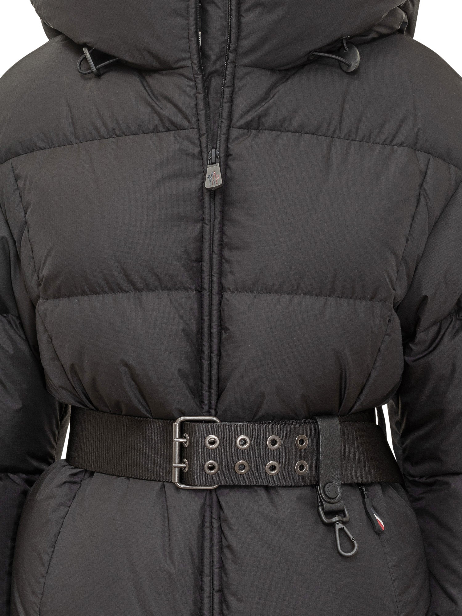 Moncler Grenoble black down jacket featuring quilted design, wrap-around hood and zip closure. The waist belt with buckle and metal details adds a technical and feminine touch.