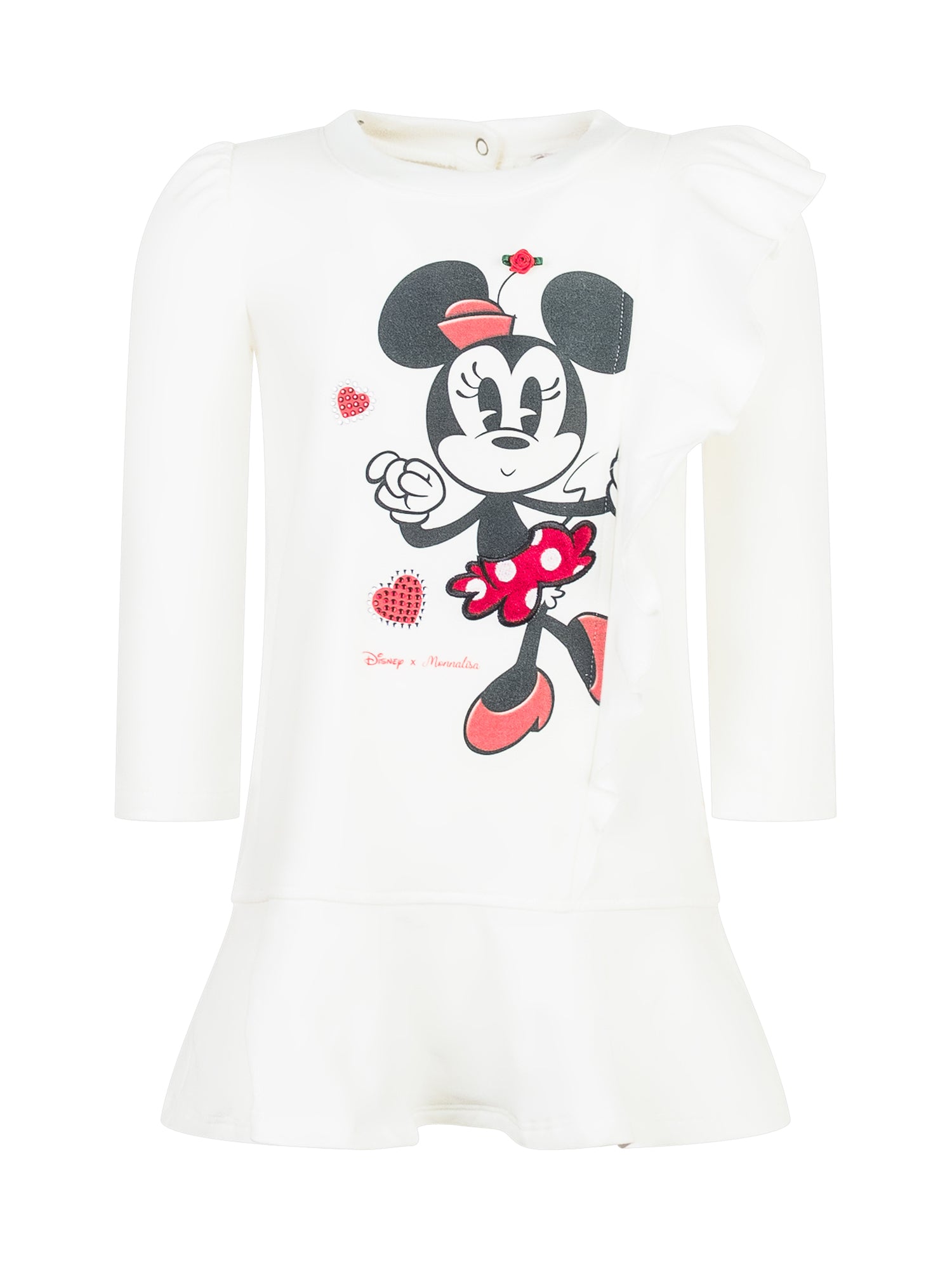 Monnalisa white dress featuring Minnie print, heart details and front ruffle accent.