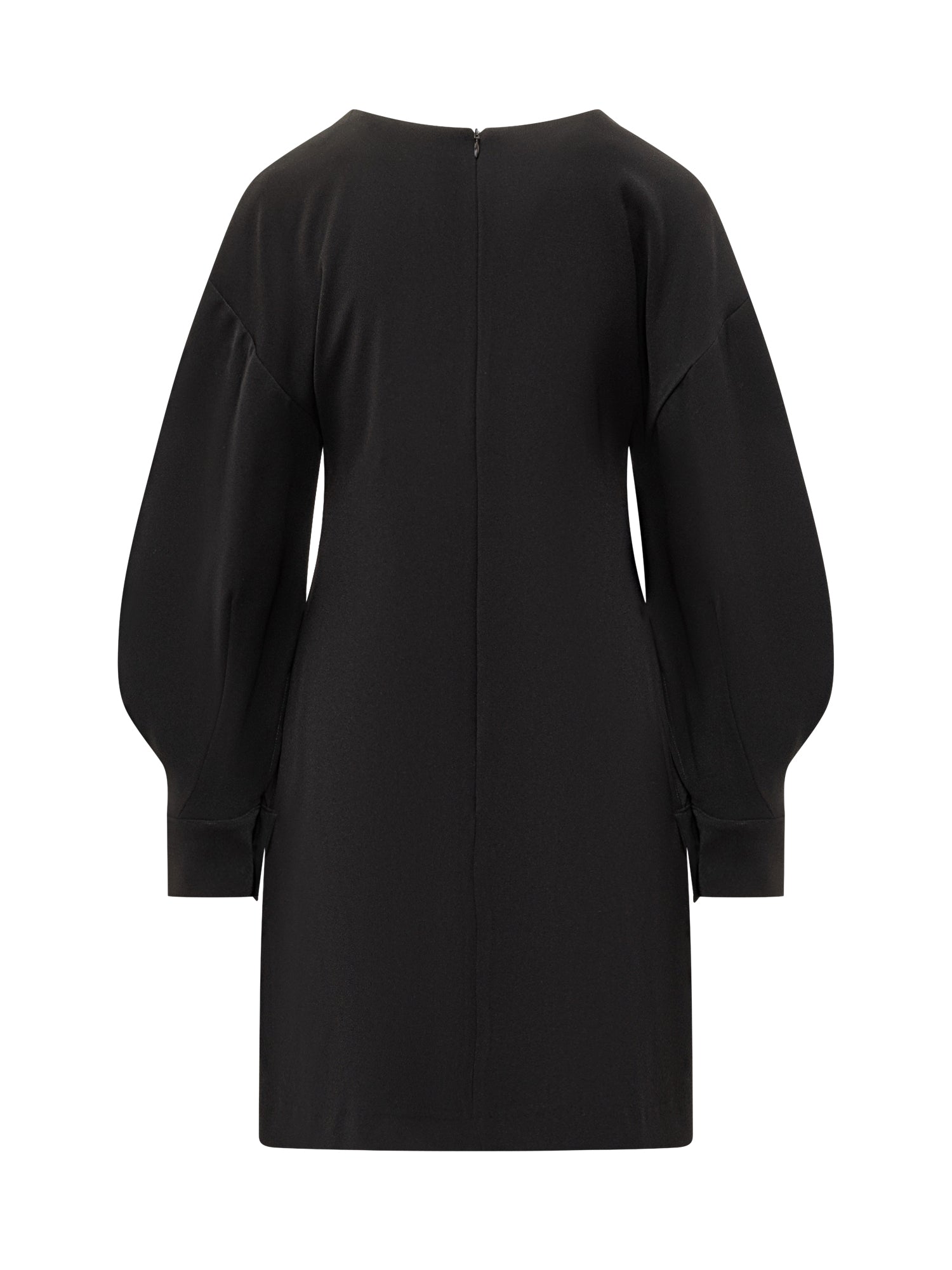 P.A.R.O.S.H. short black dress with voluminous balloon sleeves and straight silhouette. Elegant and minimal, ideal for evening events or chic looks.