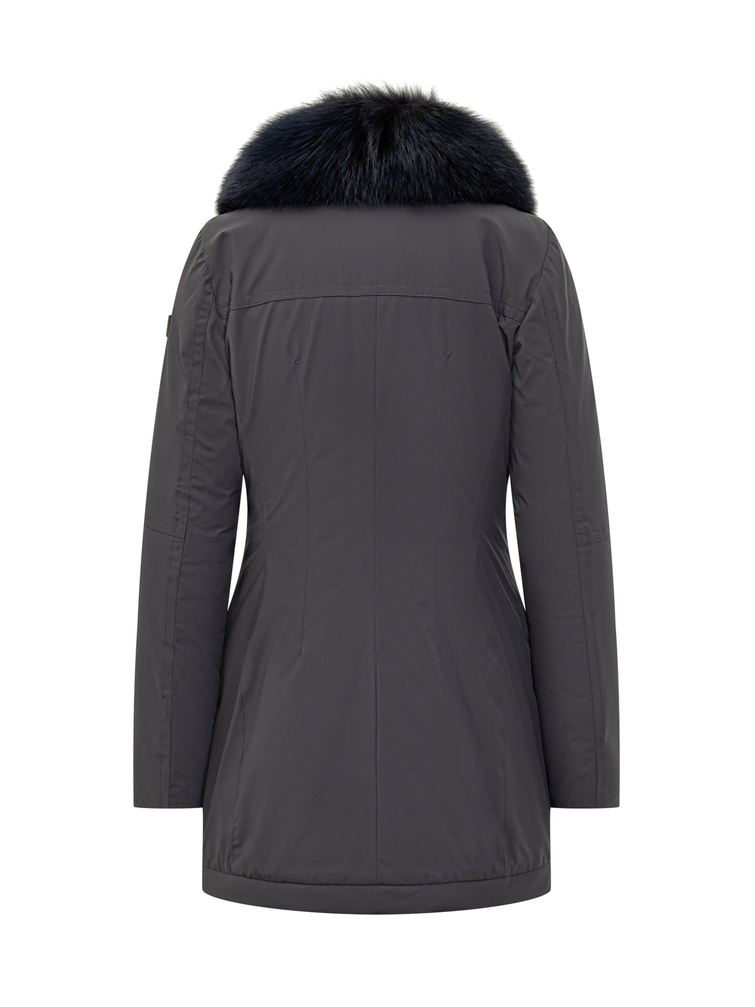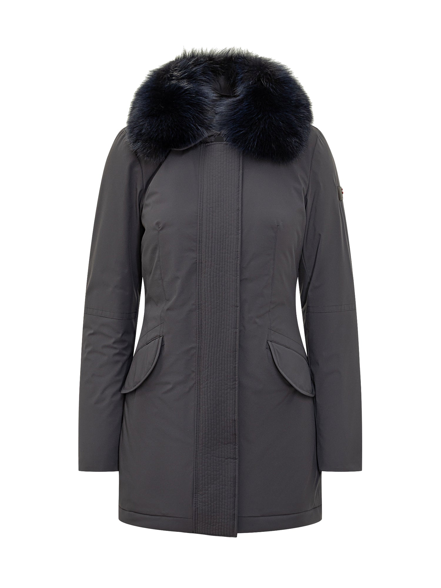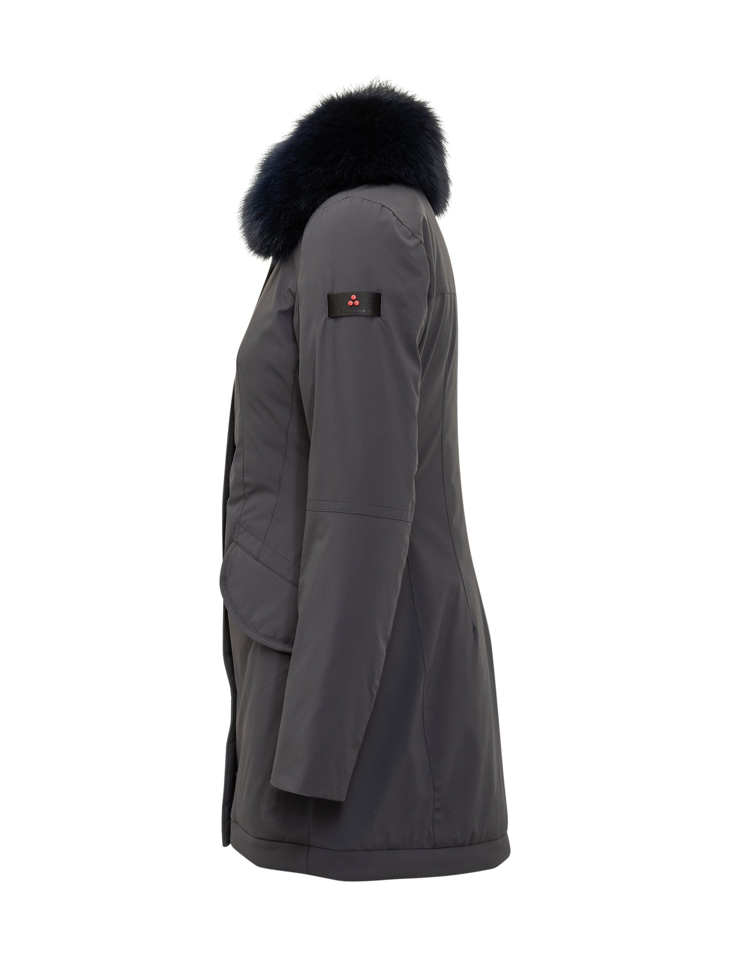 Black Peuterey parka with hood edged in blue fur and flap pockets.