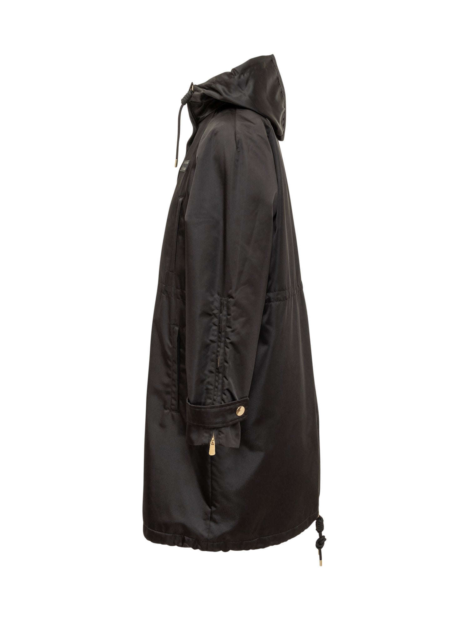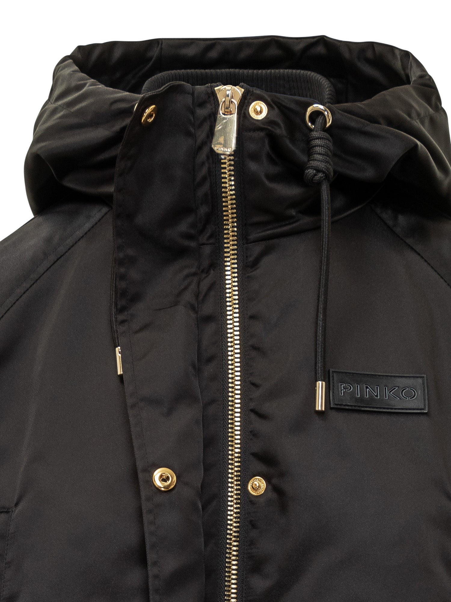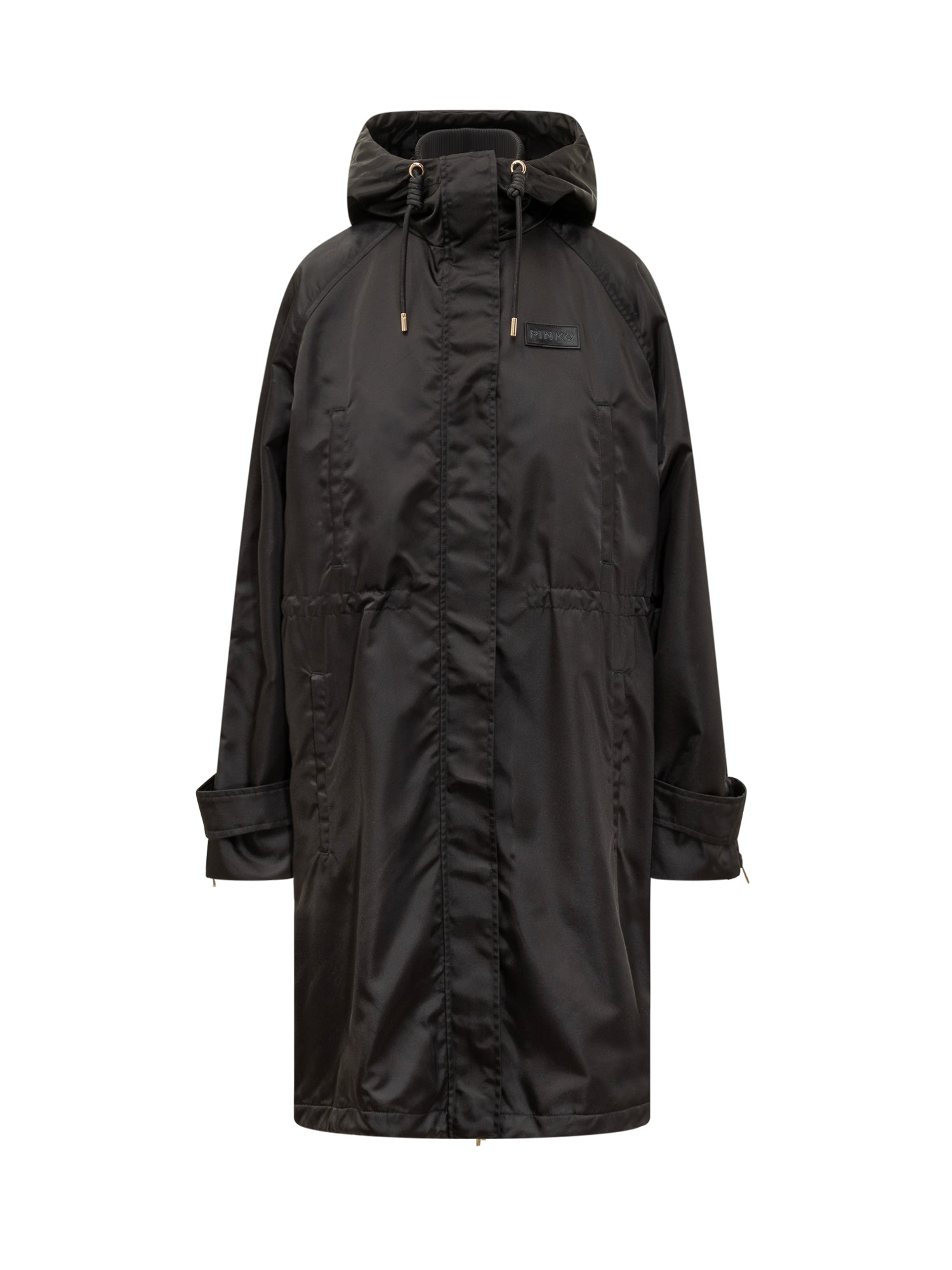 Pinko Delma padded coat in glossy technical fabric with adjustable hood and zip-button closure. Oversized fit with drawstring waist for a customizable silhouette.
