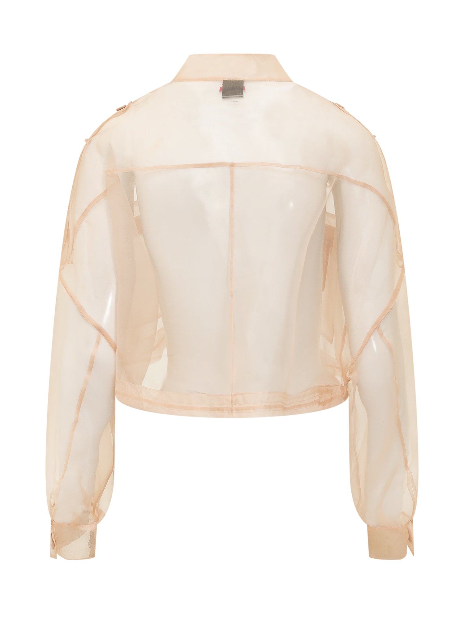Cropped organza caban jacket featuring a high collar, front button closure and patch pockets. Sheer fabric with soft volumes, perfect for elegant and contemporary looks.