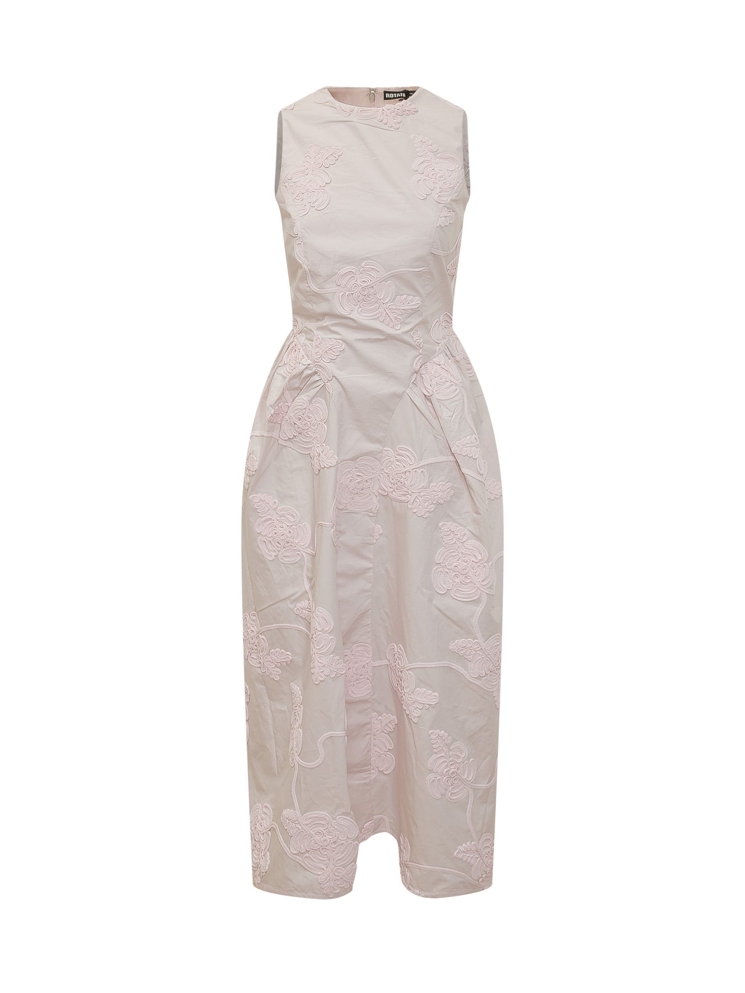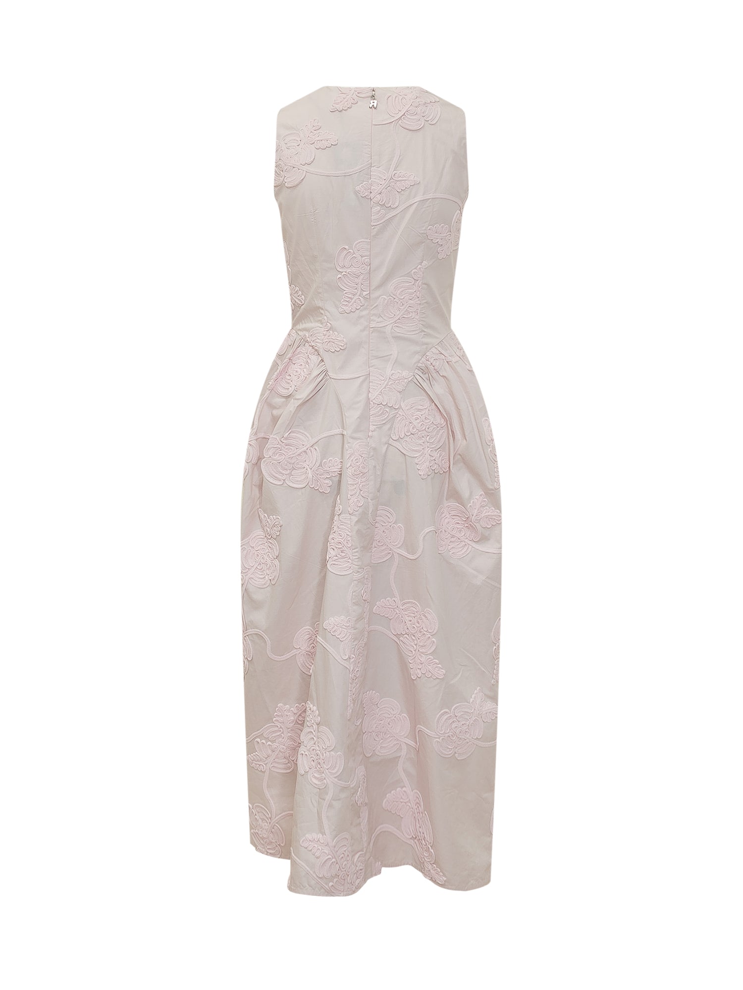Sleeveless midi dress with raised floral detailing and round neckline.