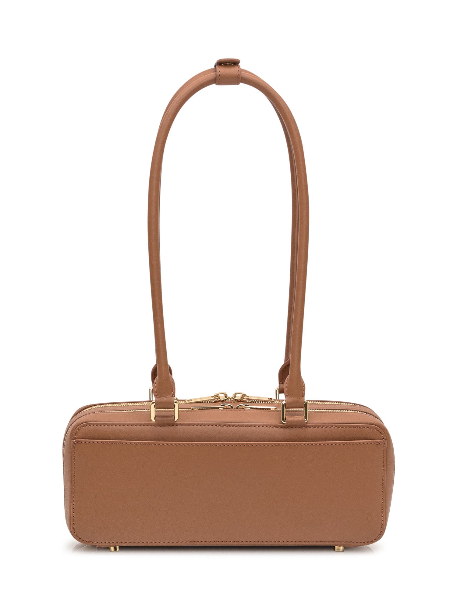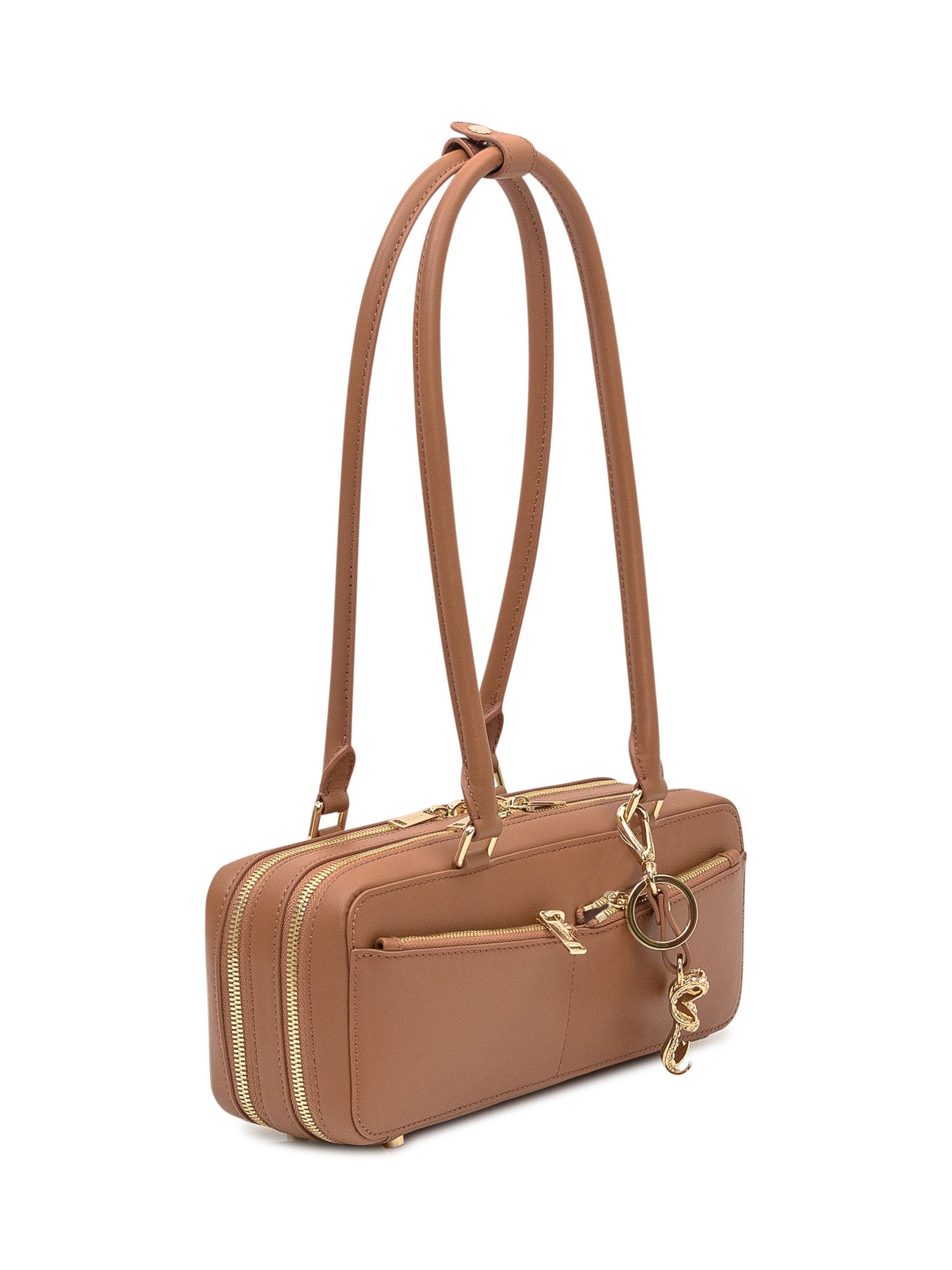 Brown suede leather bag. Closure with zipper. Front pocket with zip closure. Detachable bow ornament. Two long leather handles.