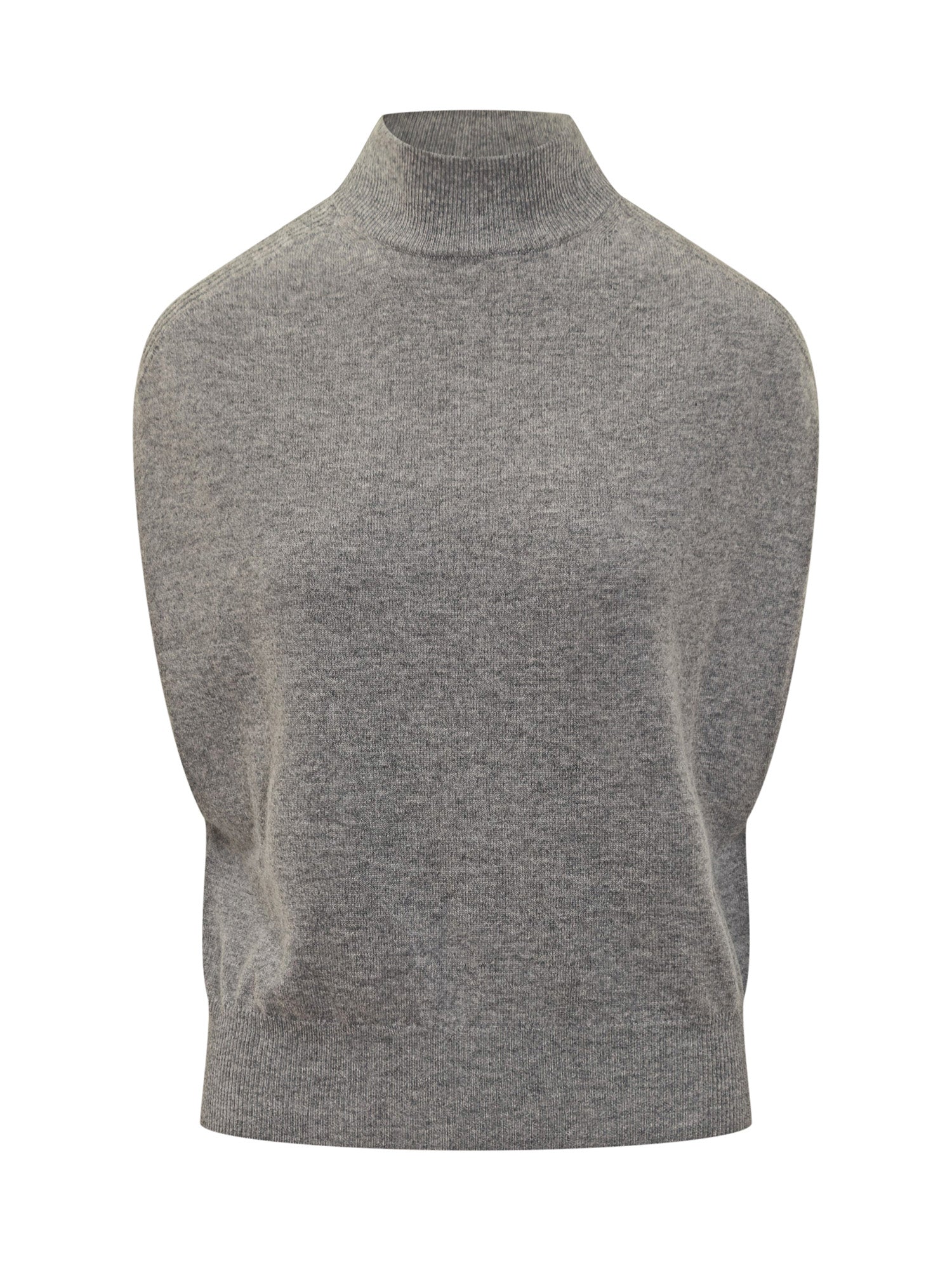 Women's grey wool turtleneck vest with sleeveless design, perfect for layering. Minimal and elegant style, ideal for colder seasons.