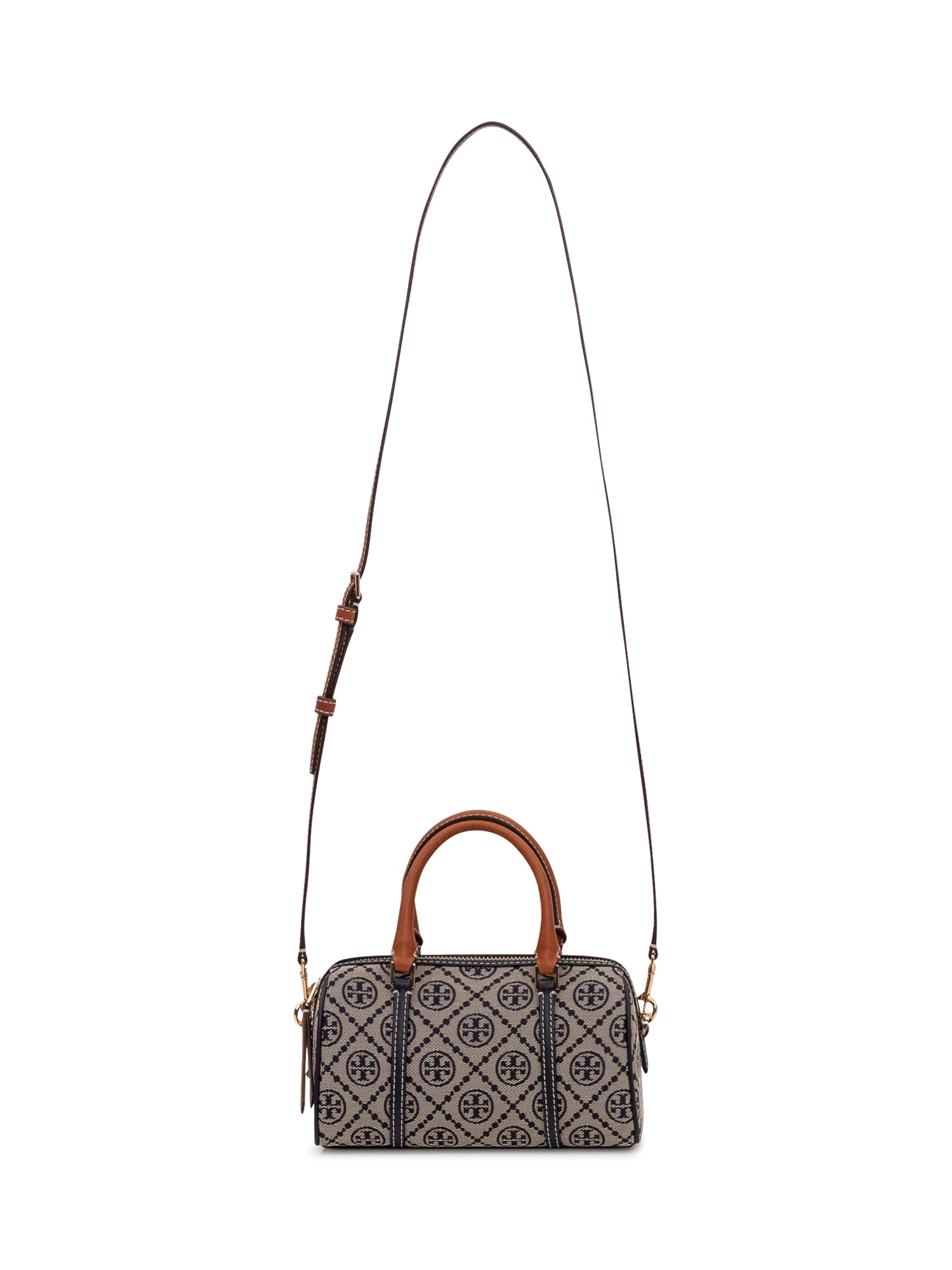 Mini top handle barrel bag with cylindrical structure and double top handles. All over geometric pattern with contrasting vertical details. Top zip closure and compact design ideal for everyday use.