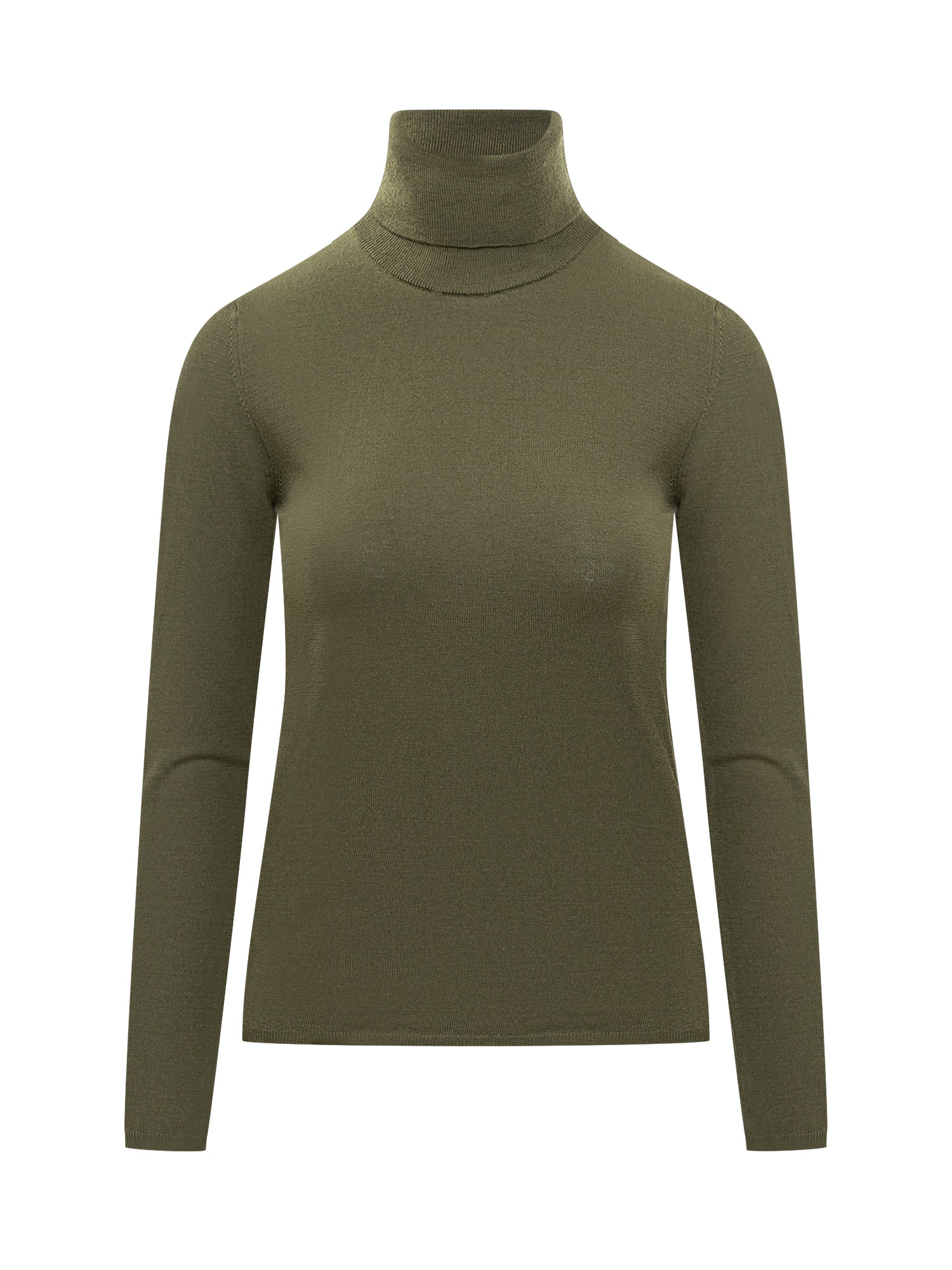 Military green fine wool turtleneck with a slim fit and minimal design, ideal for elegant outfits and versatile layering.