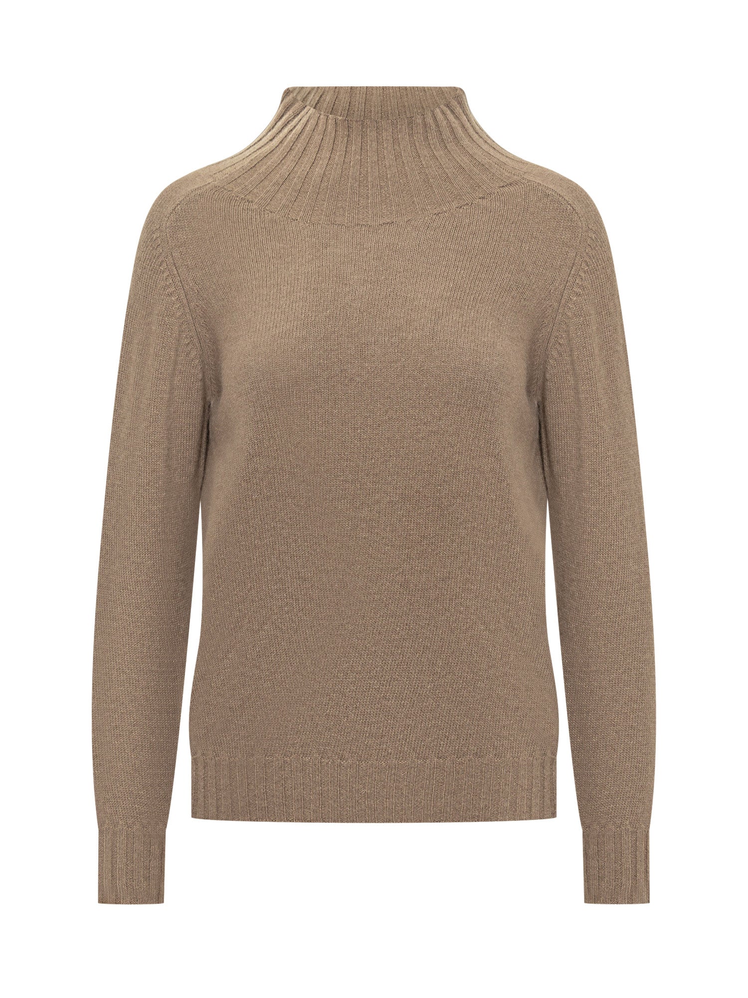 Taupe fine-knit sweater with ribbed high neck, minimal design and clean lines, perfect for elegant and versatile looks.