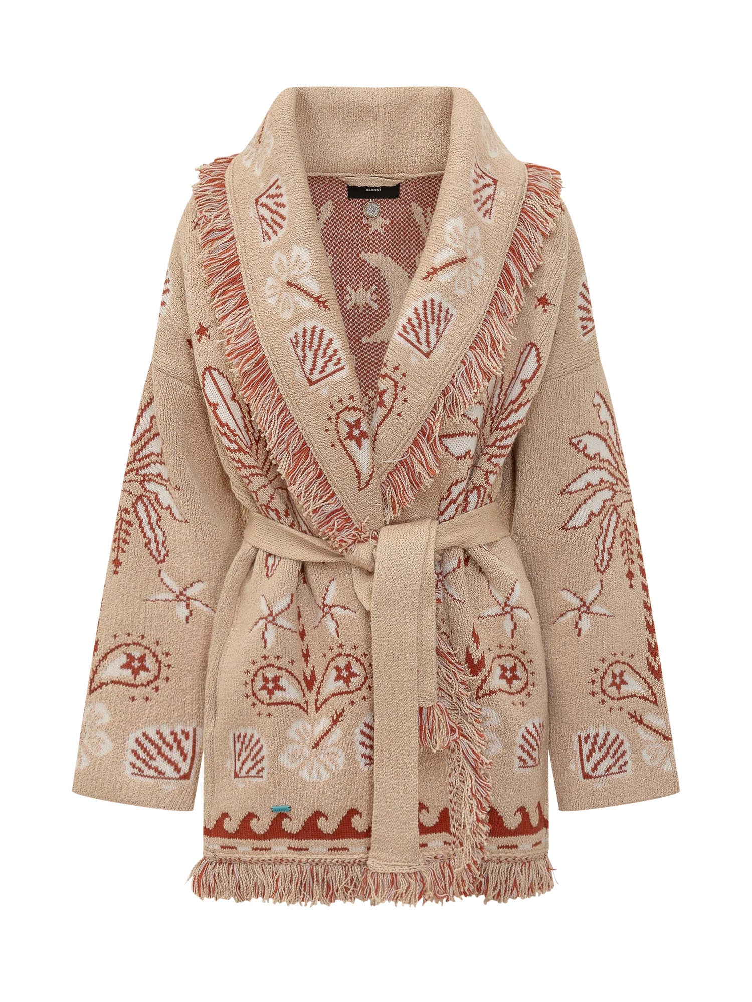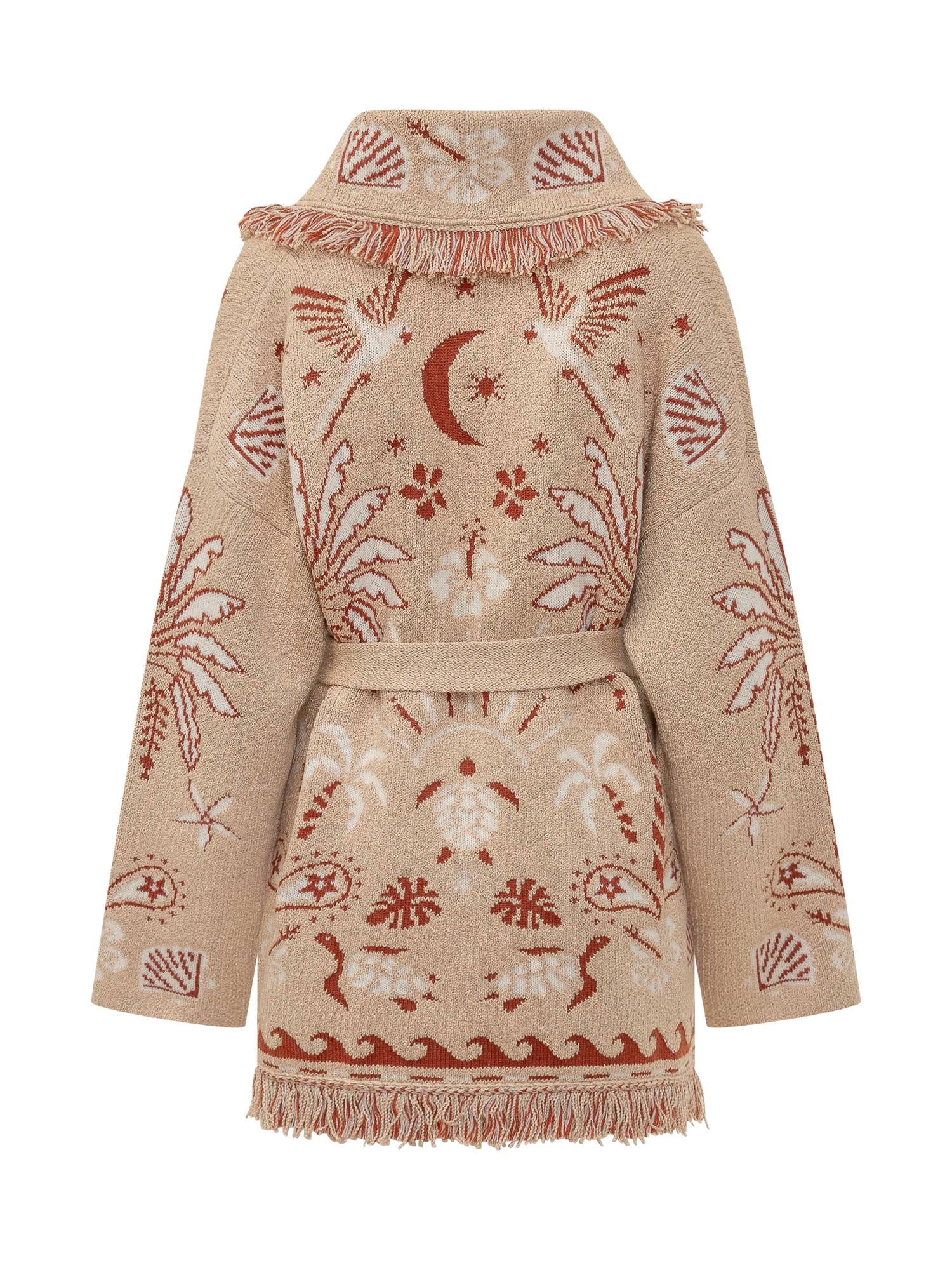 Jacquard knit cardigan with belted waist and fringe detailing along collar and hem. Nature-inspired patterns create a cozy boho vibe, ideal as a stylish seasonal layer.