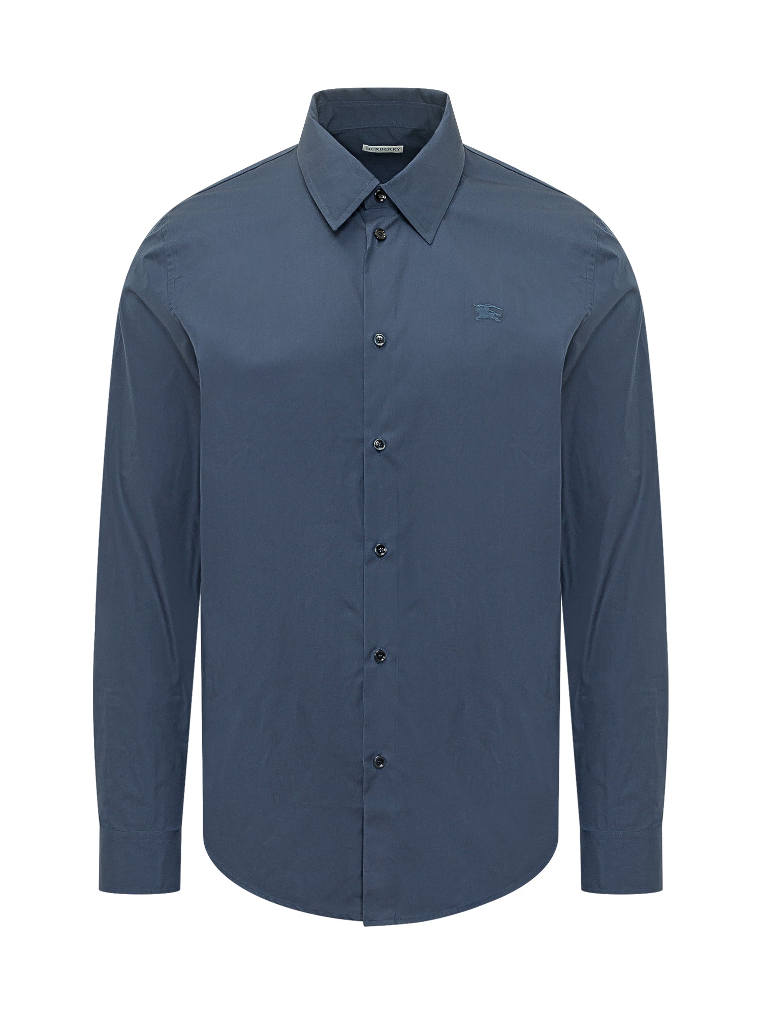Long sleeve shirt with classic collar, front button closure, button cuffs, tone on tone chest embroidery.