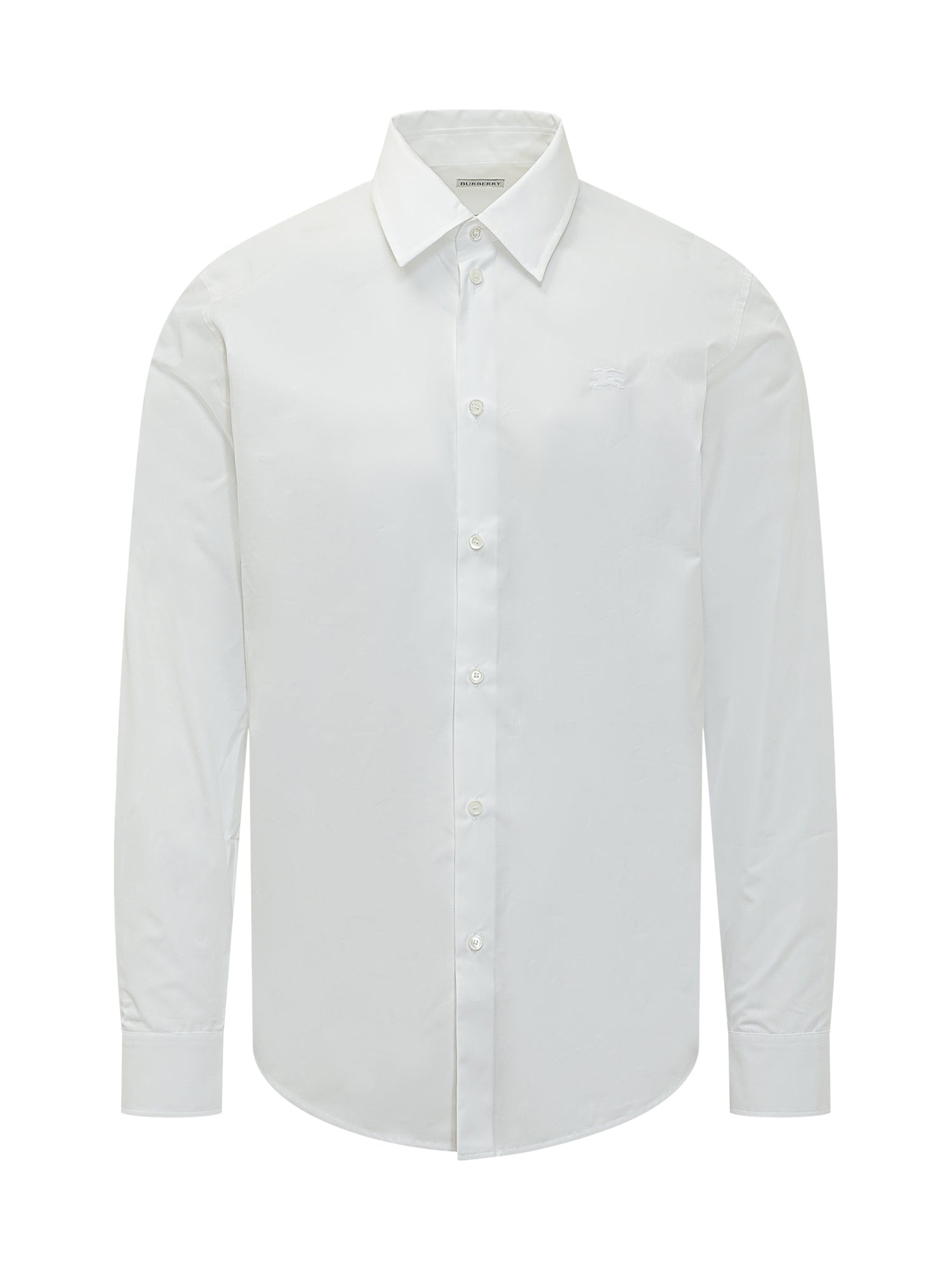 Long sleeve shirt with classic collar, front button closure, button cuffs, tone on tone chest embroidery.