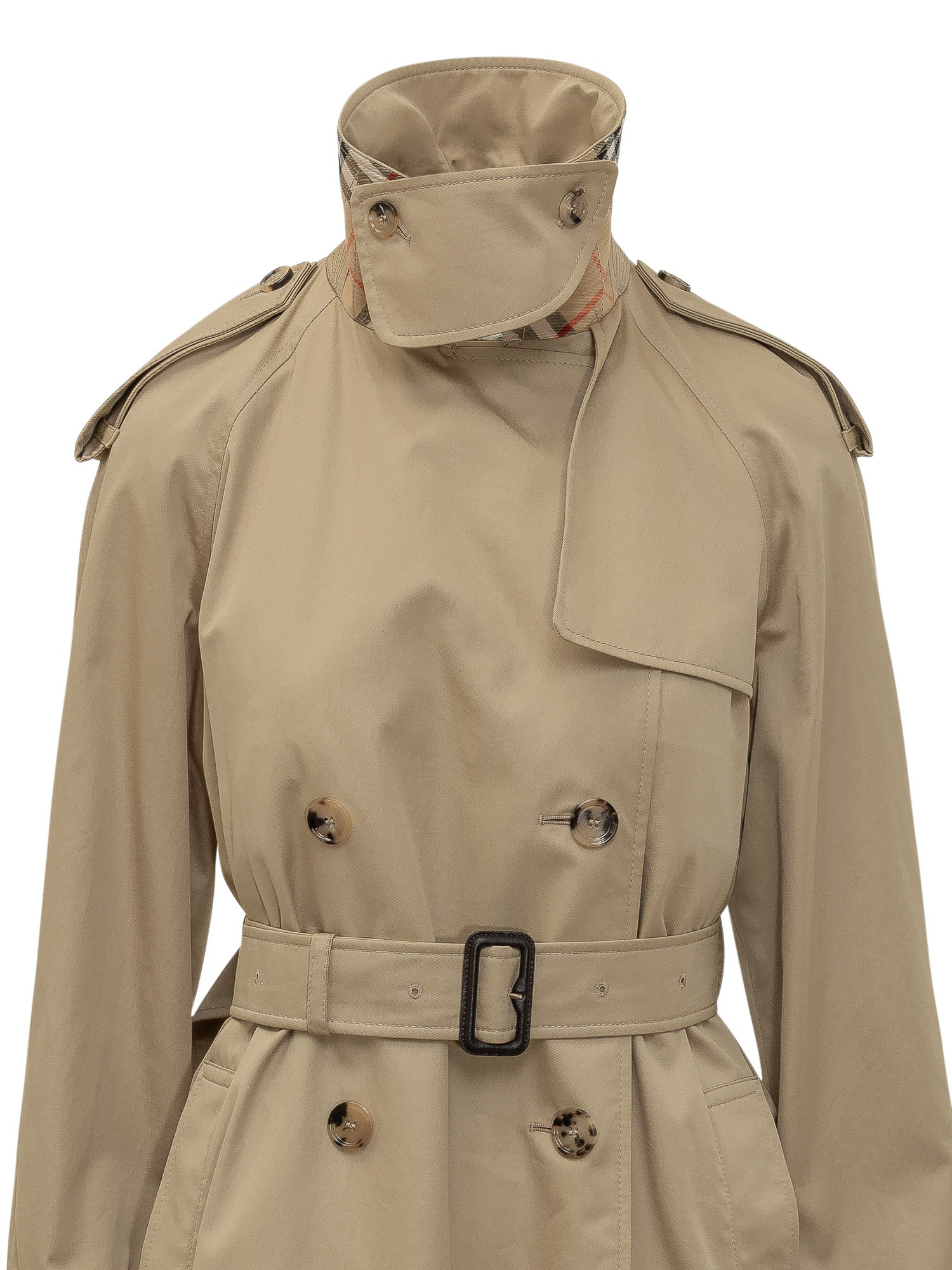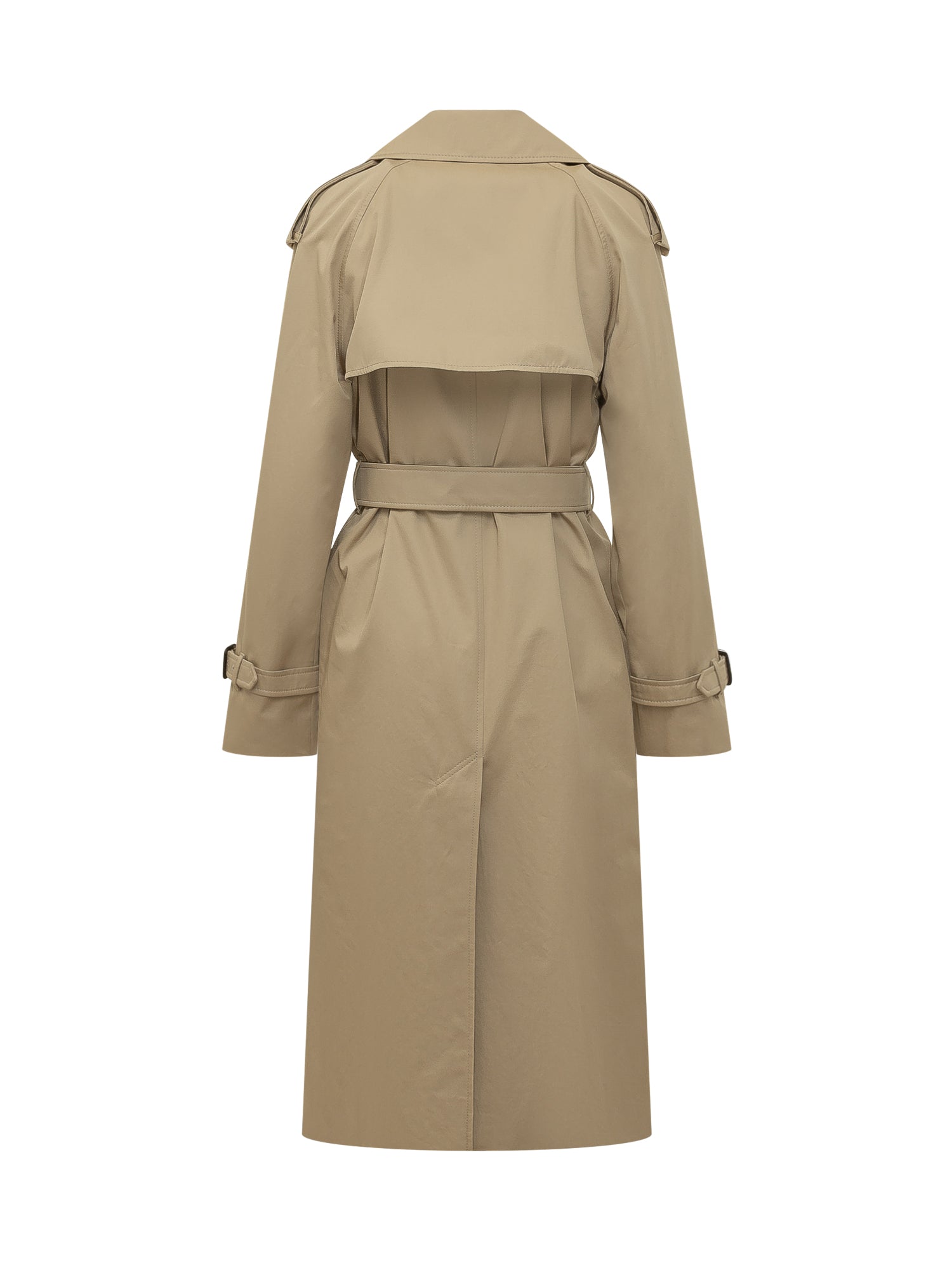 Long trench coat with a double-breasted design, matching waist belt and structured epaulettes. Wide collar, storm flap and side welt pockets. Front button closure. Timeless and refined fit.