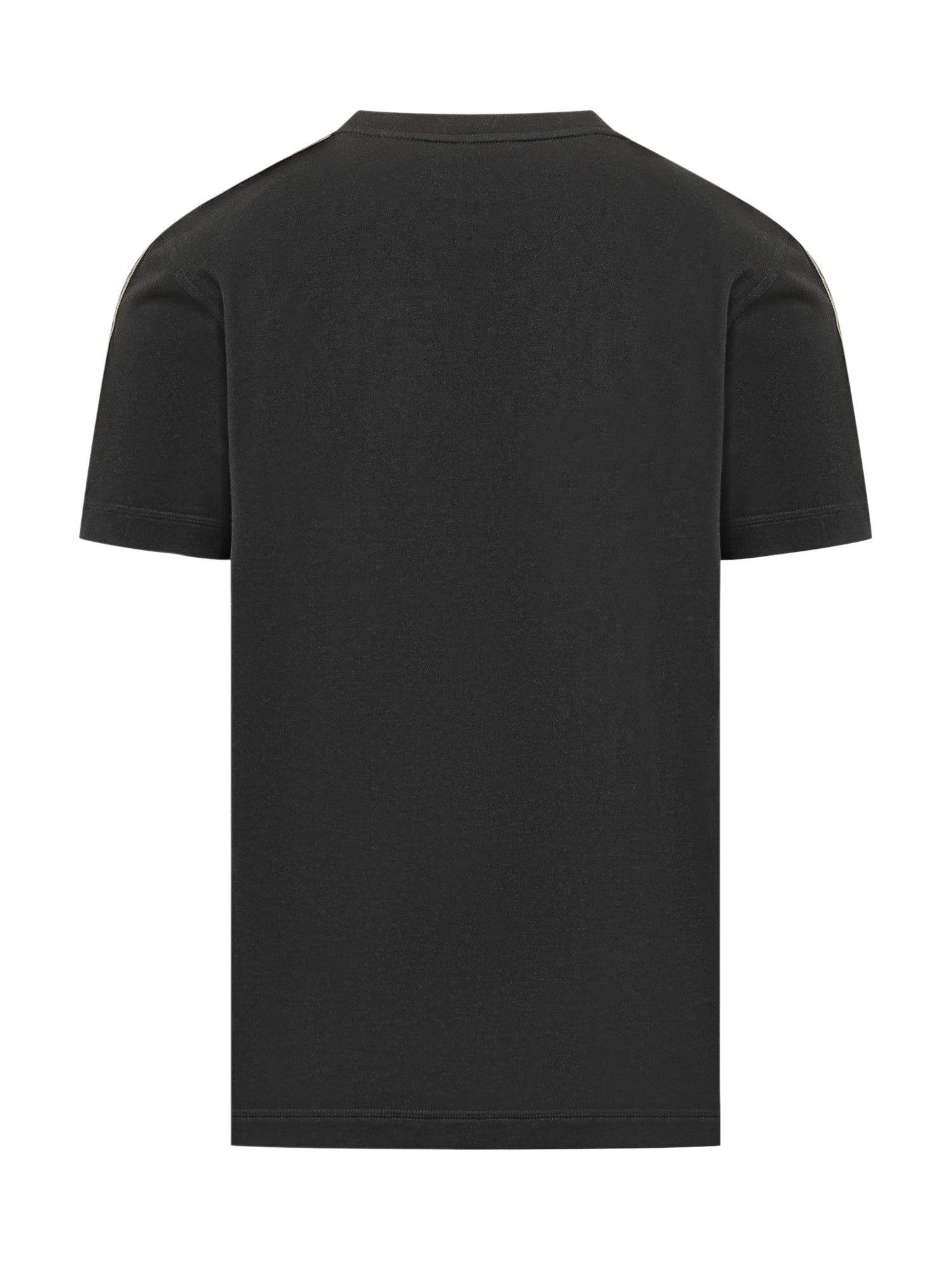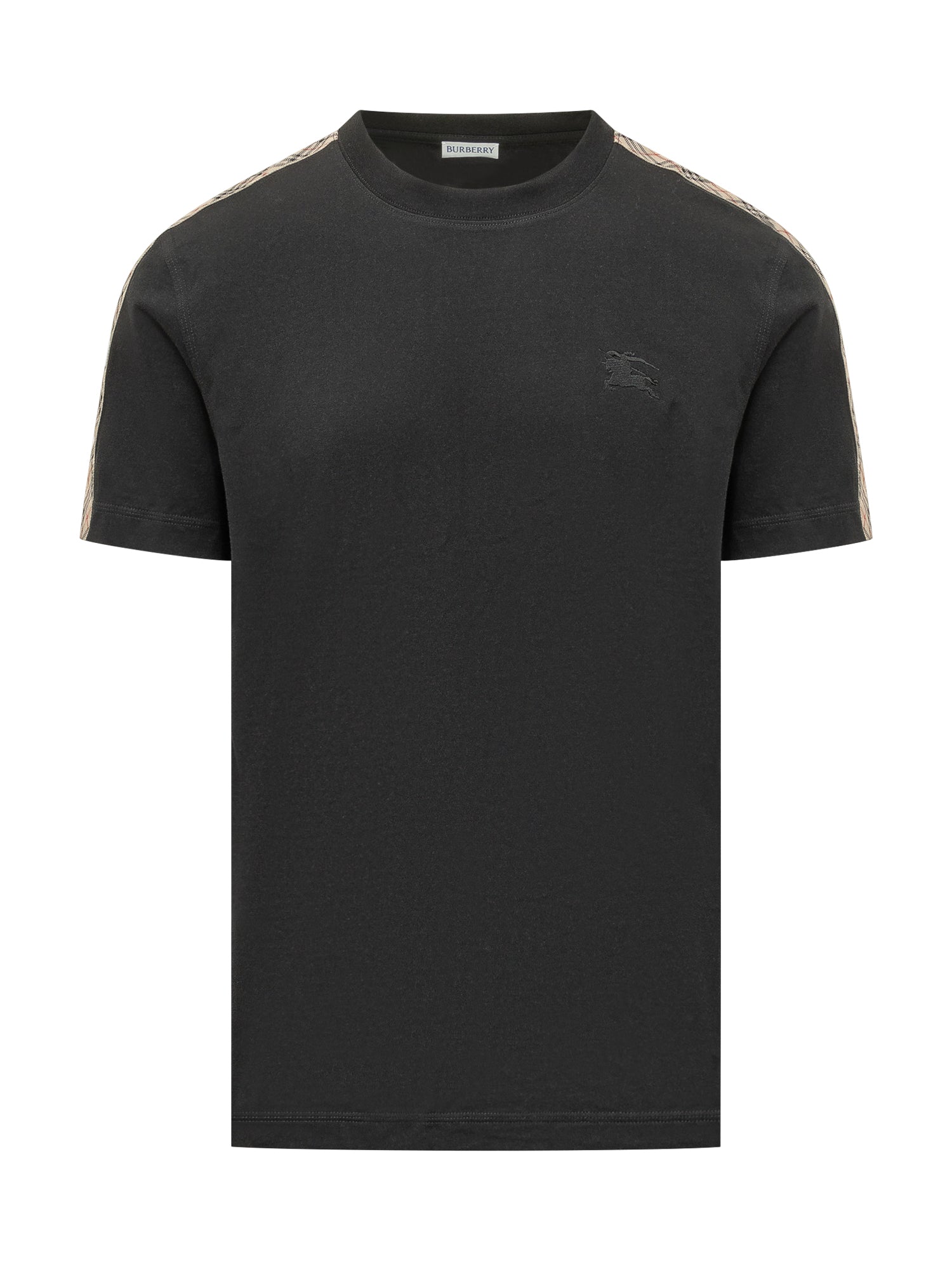 Short-sleeve crew neck T shirt featuring iconic check inserts on the shoulders. Clean design with an embroidered chest detail.