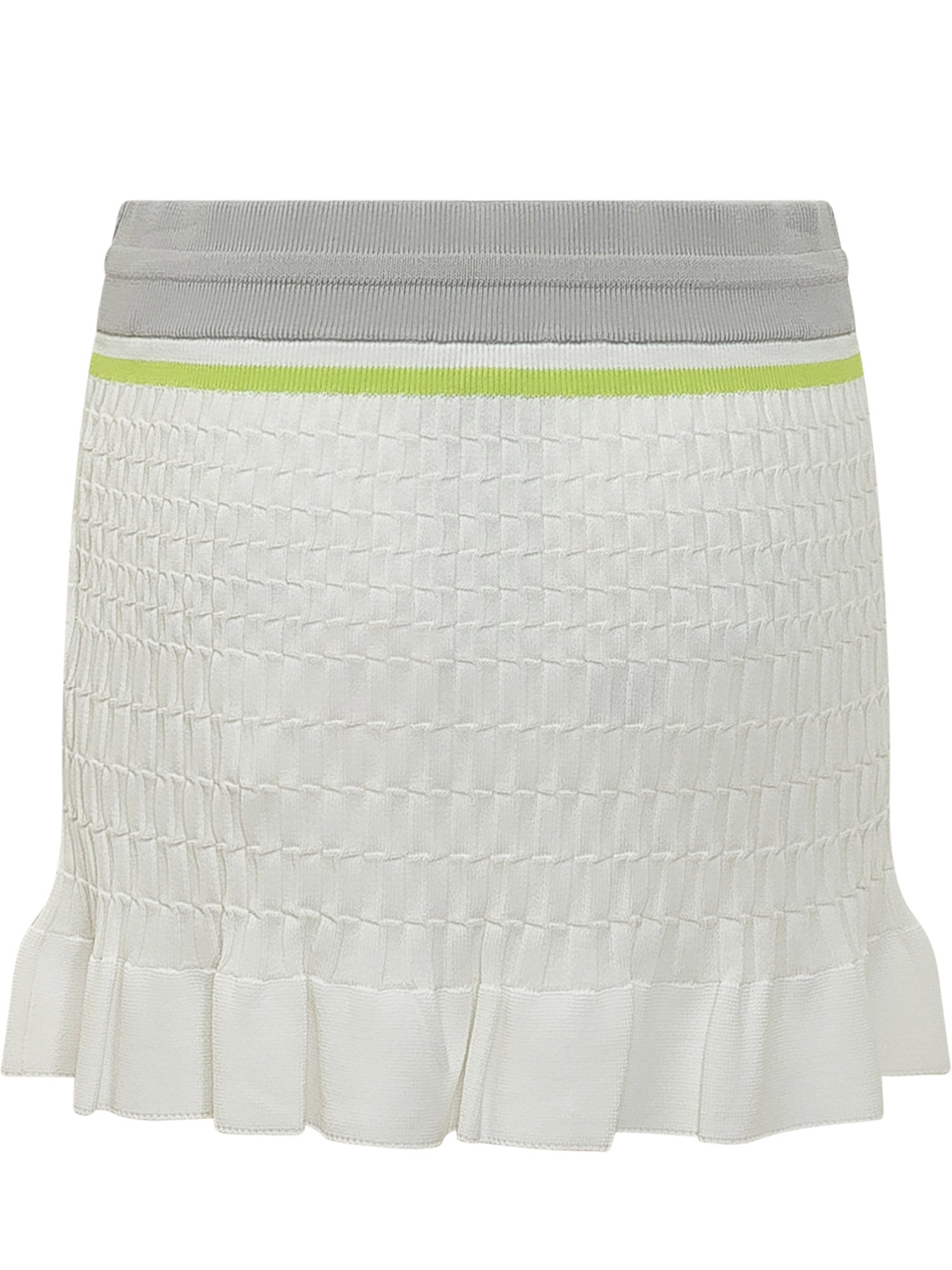 Midi knitted skirt with textured stitching and flounced hem. Ribbed waistband with adjustable drawstring for a comfortable sporty fit.