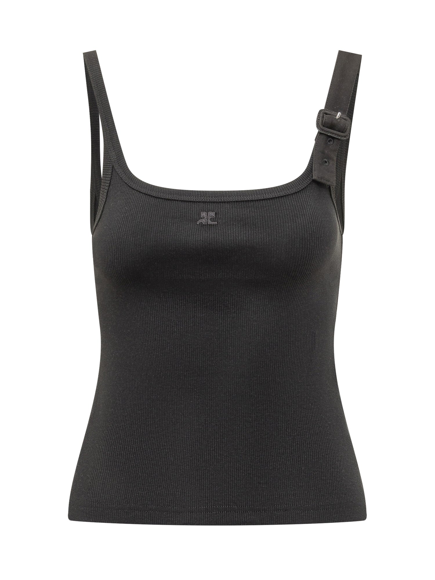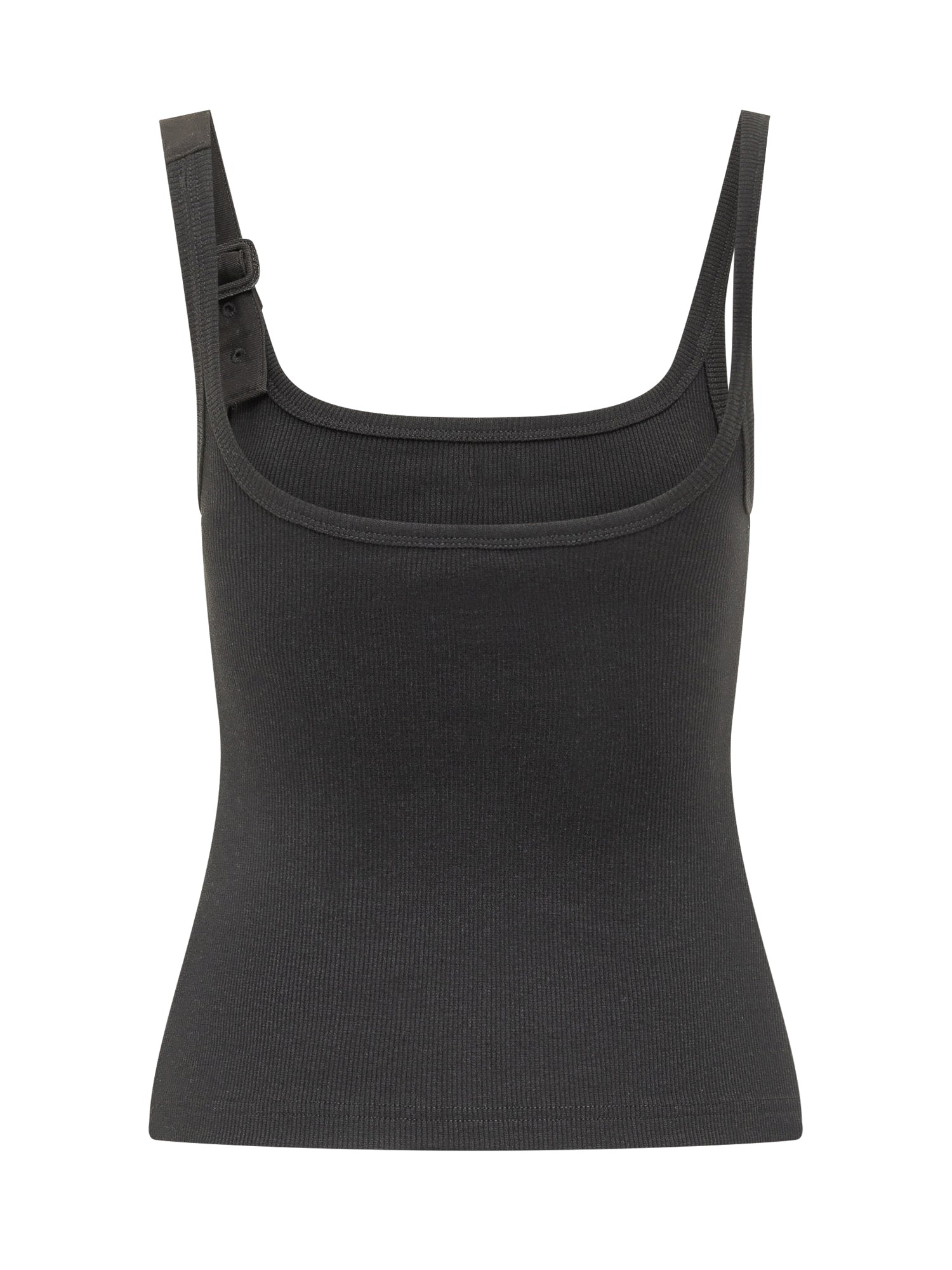 Ribbed knit tank top with square neckline and wide straps. Slim fit inspired by 90s silhouettes. Adjustable buckle detail on the strap and stretchy construction for enhanced comfort.