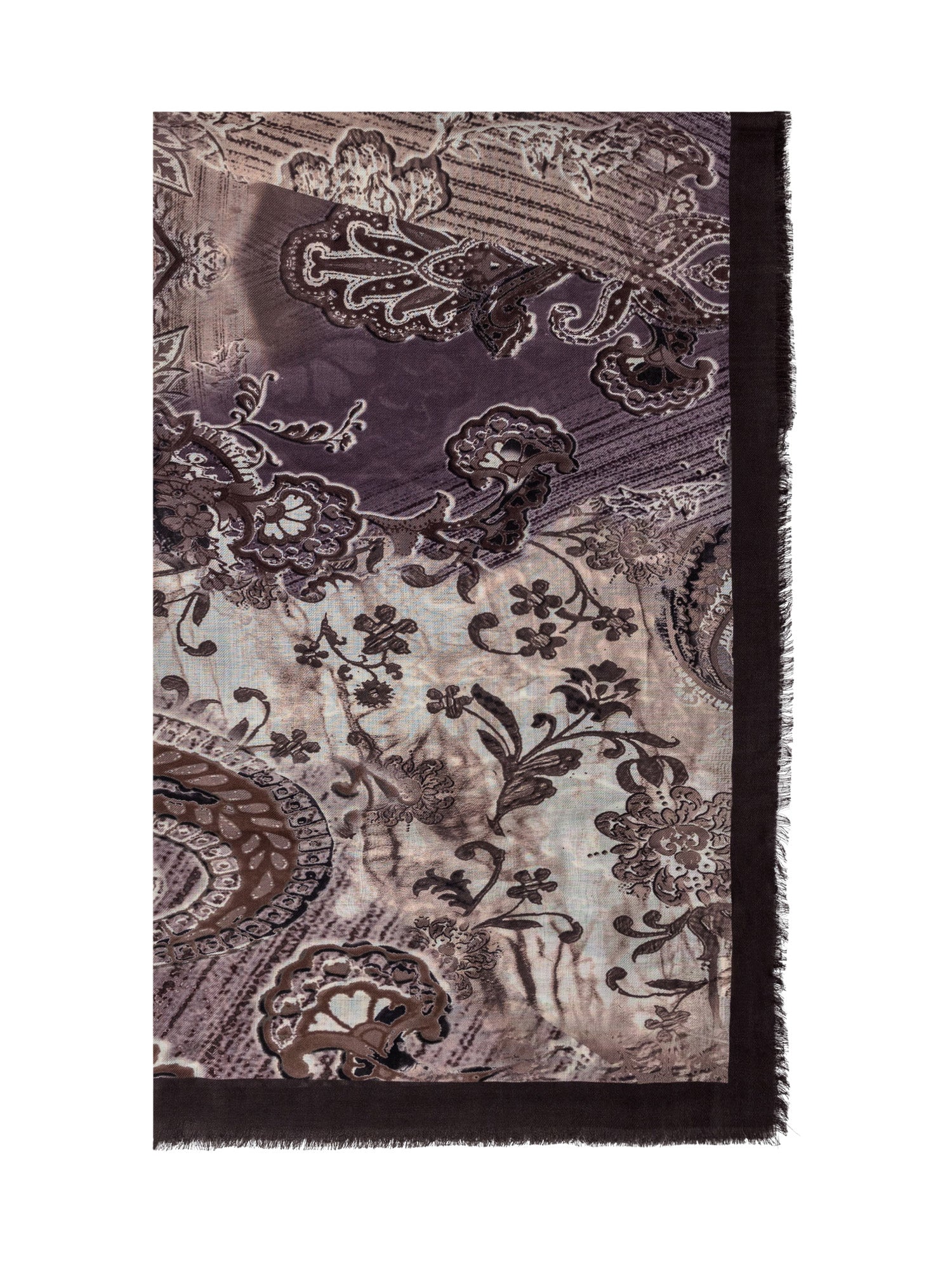 D'Aniello scarf in lightweight fabric with floral and paisley print in brown and beige tones.