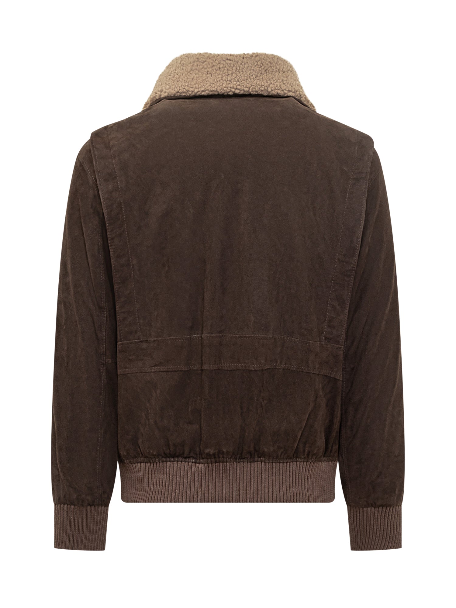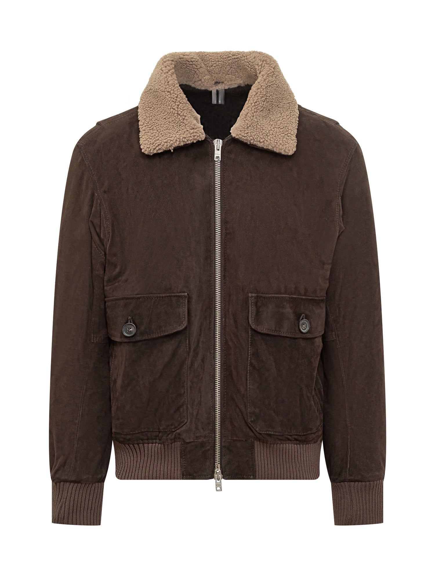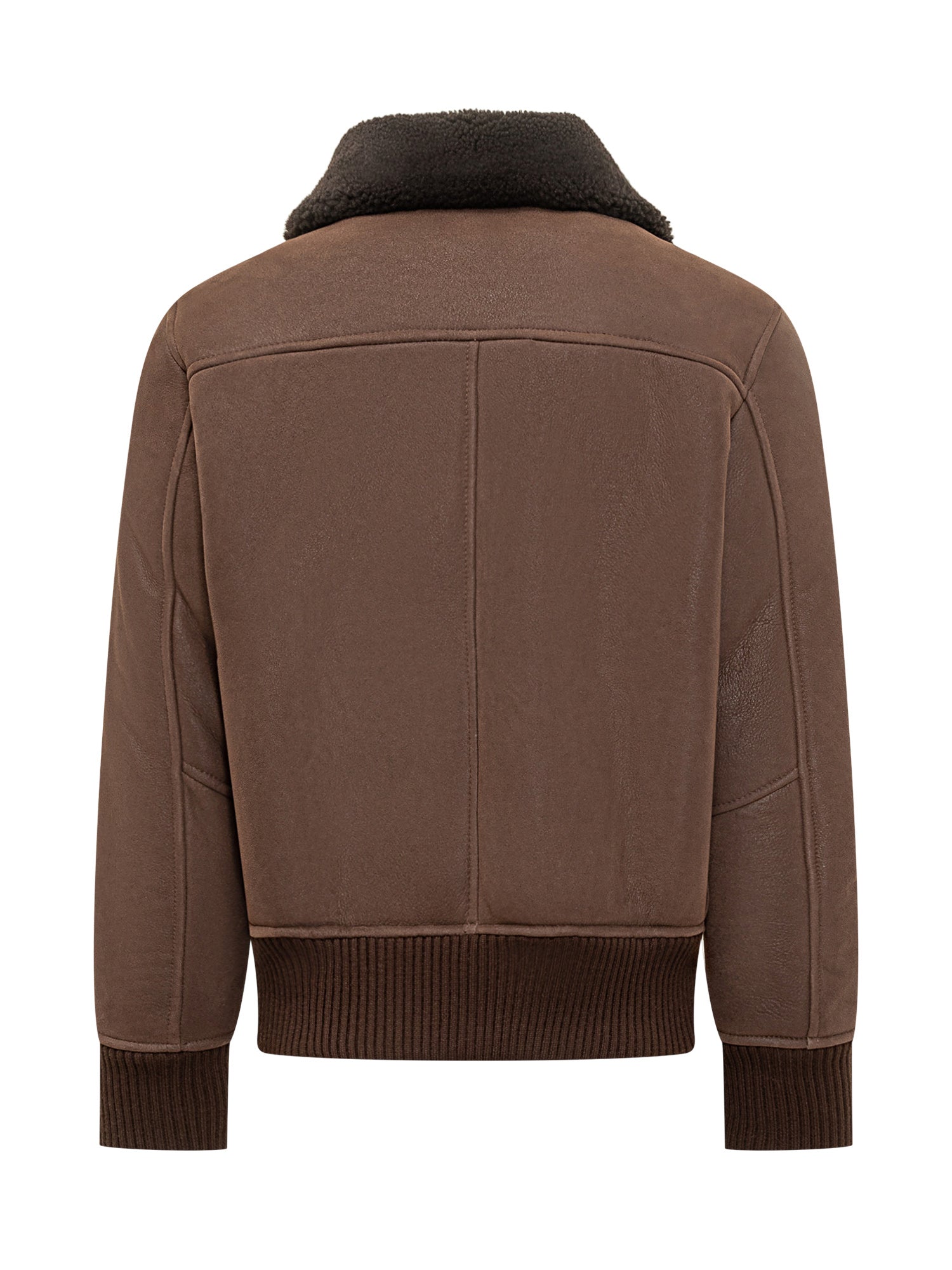 Dfour brown leather jacket with contrast shearling collar, flap front pockets and zip closure.
