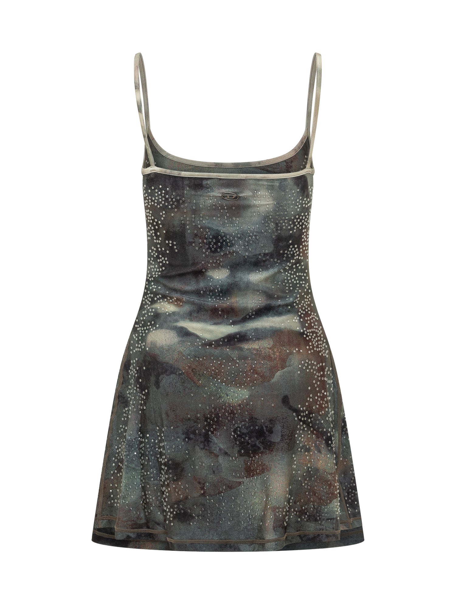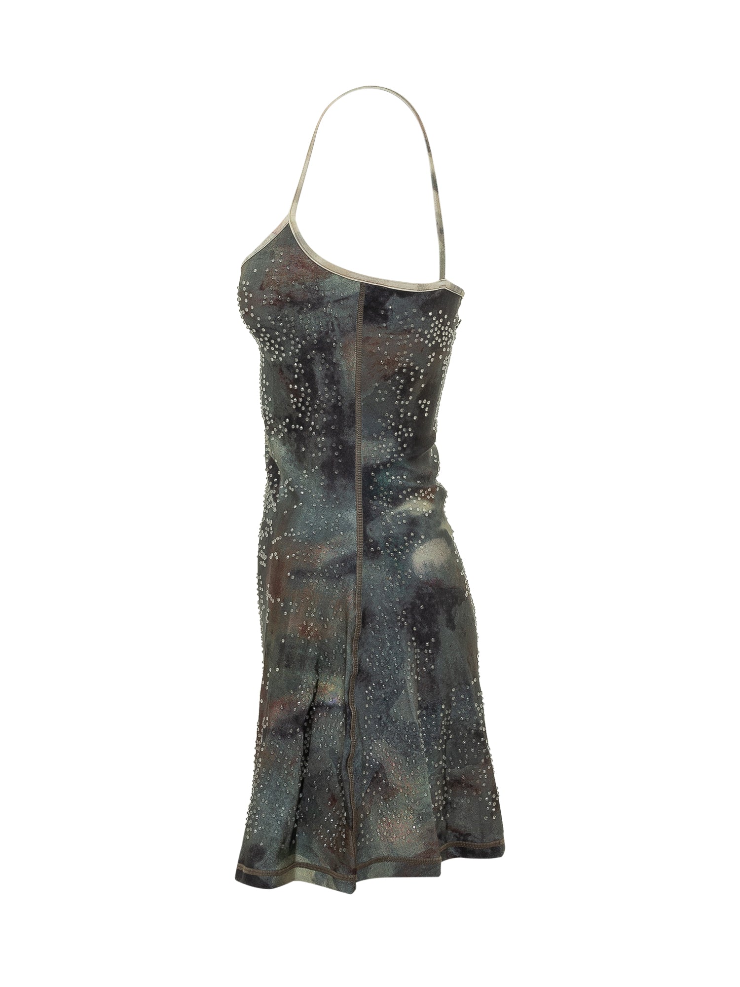 Short slip dress with thin straps and all-over print. Fitted, feminine silhouette.
