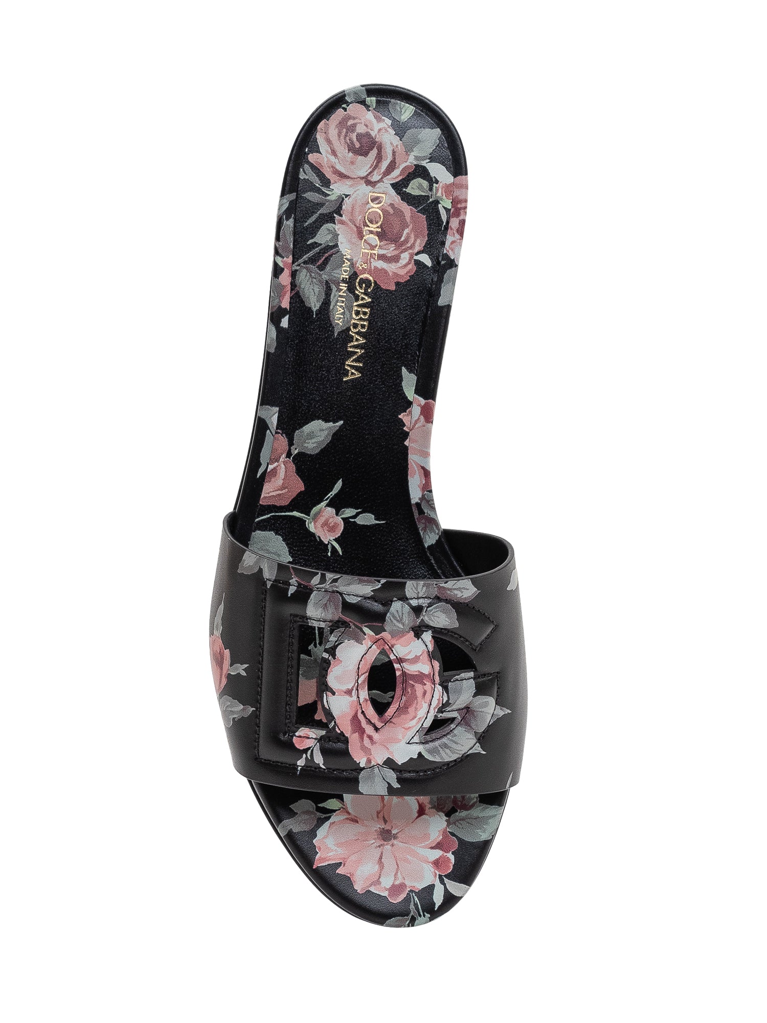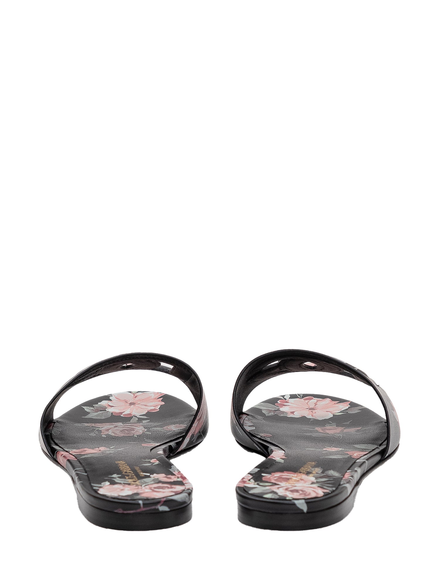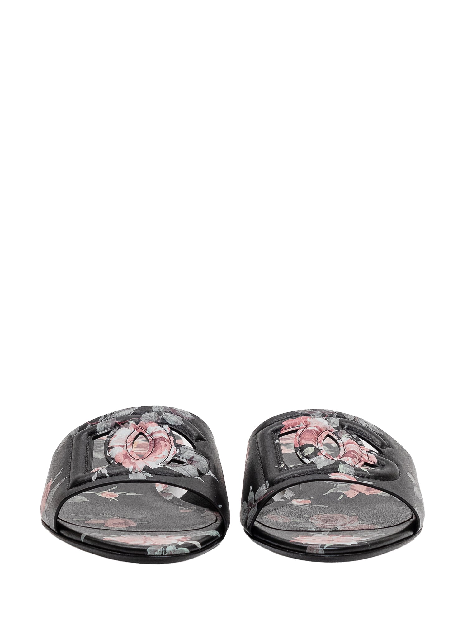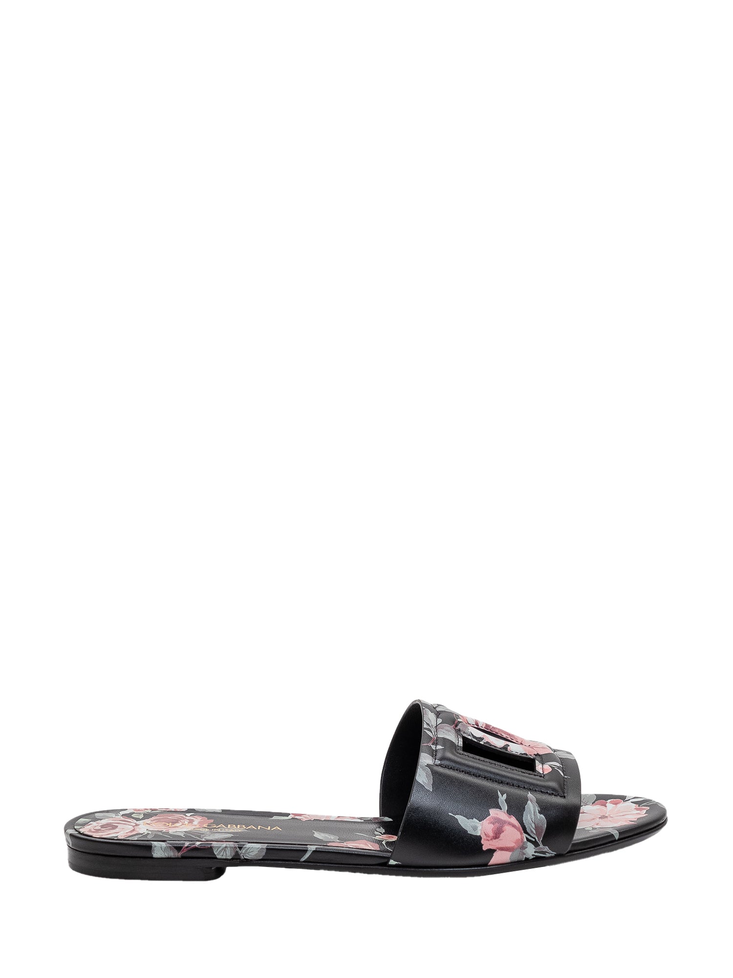 Flat leather slide featuring a clean design with a floral-patterned front strap.