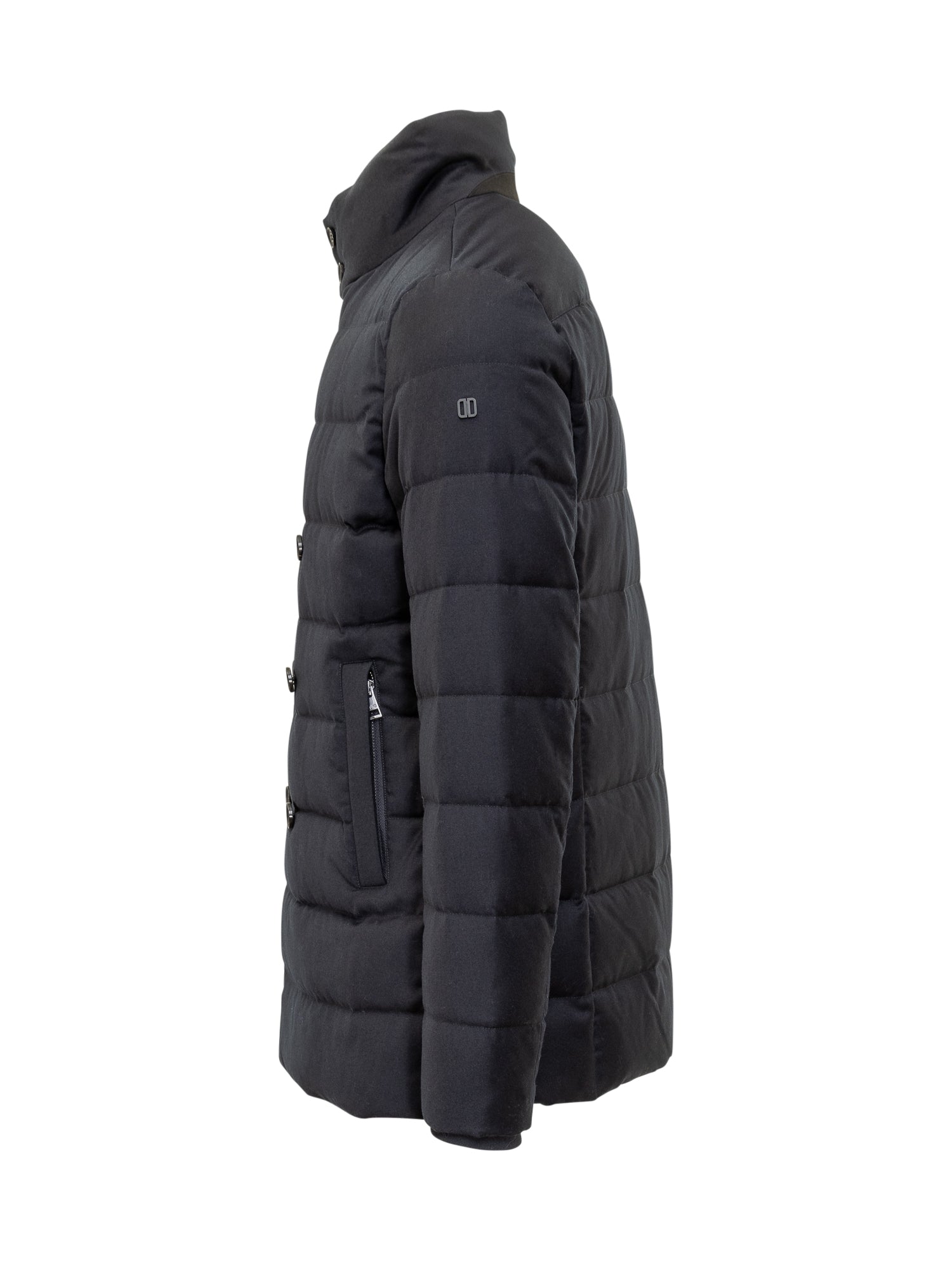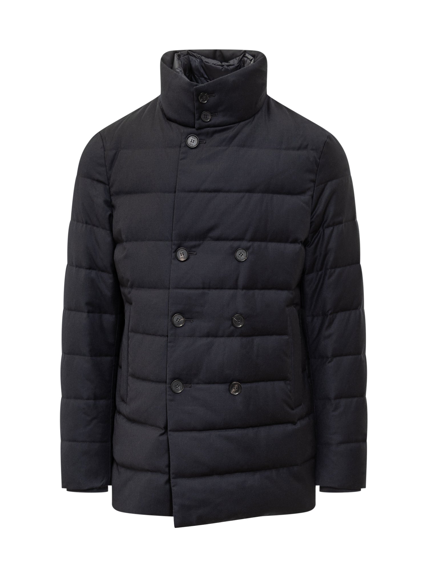 Duno blue double-breasted down jacket with high collar.