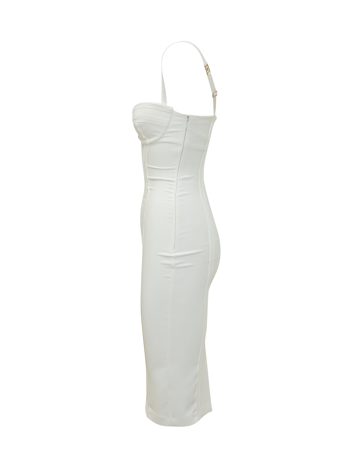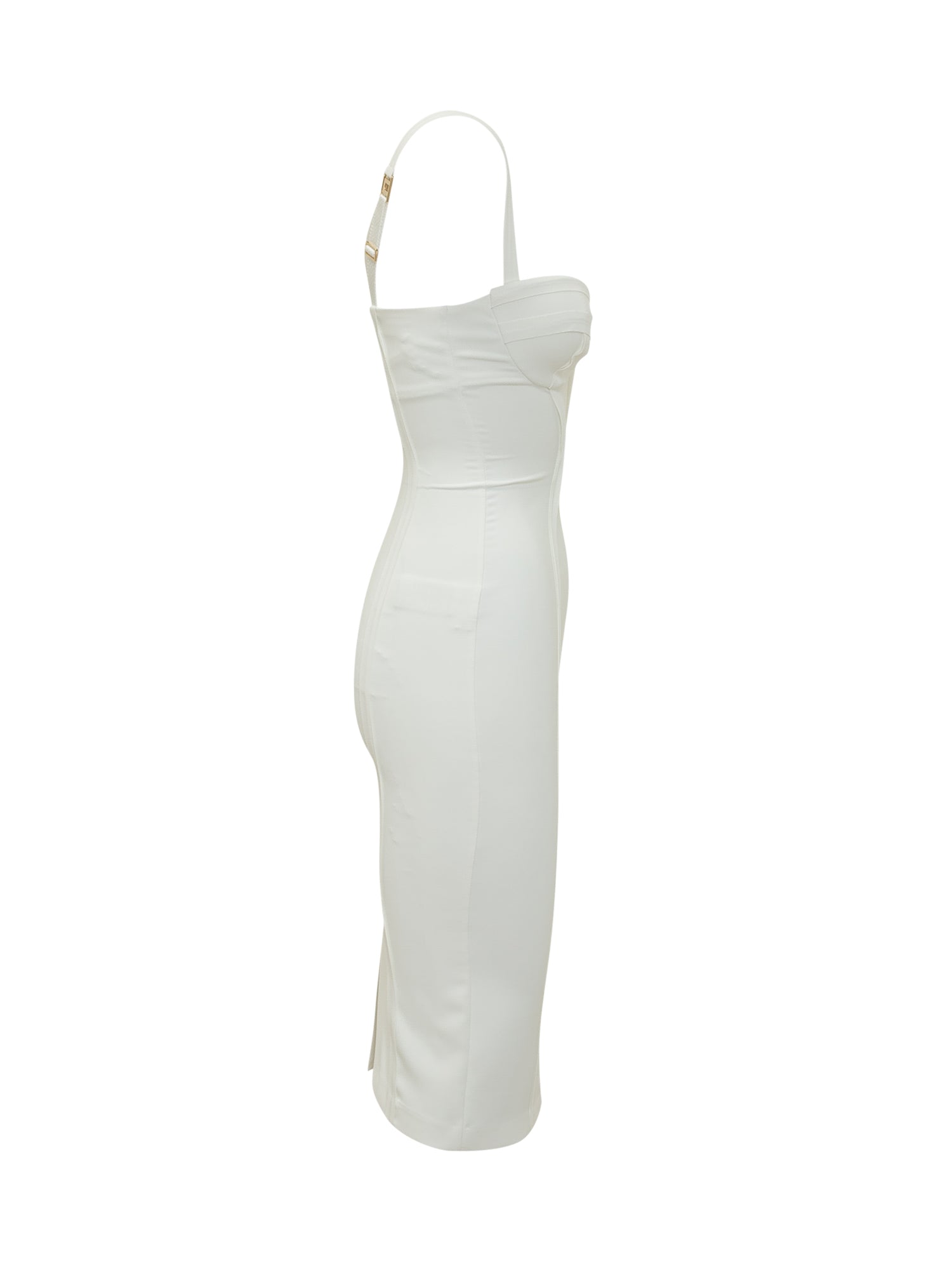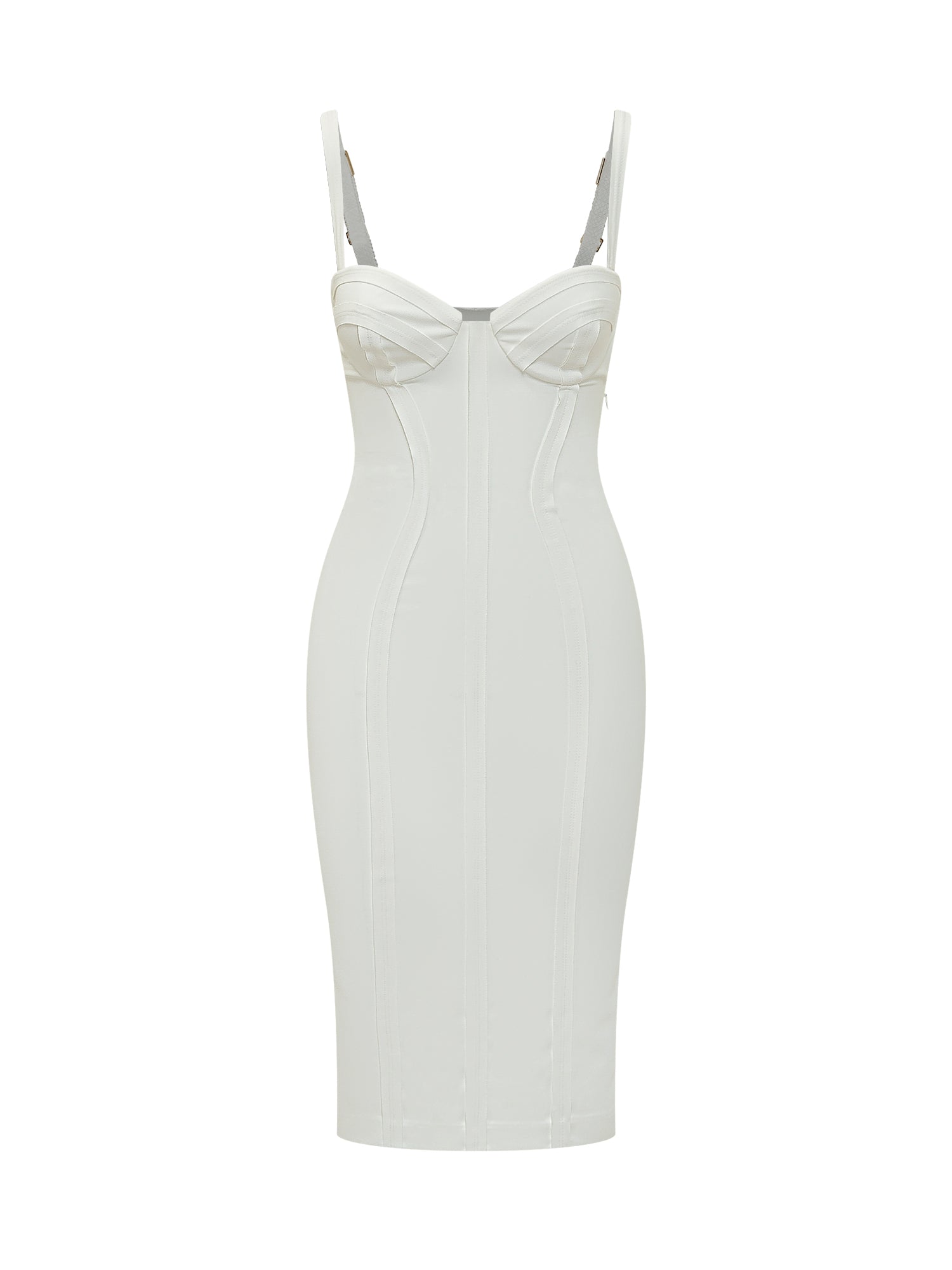 Fitted midi dress featuring a structured corset-style bodice and sculpted seams. Adjustable slim straps enhance the fit.