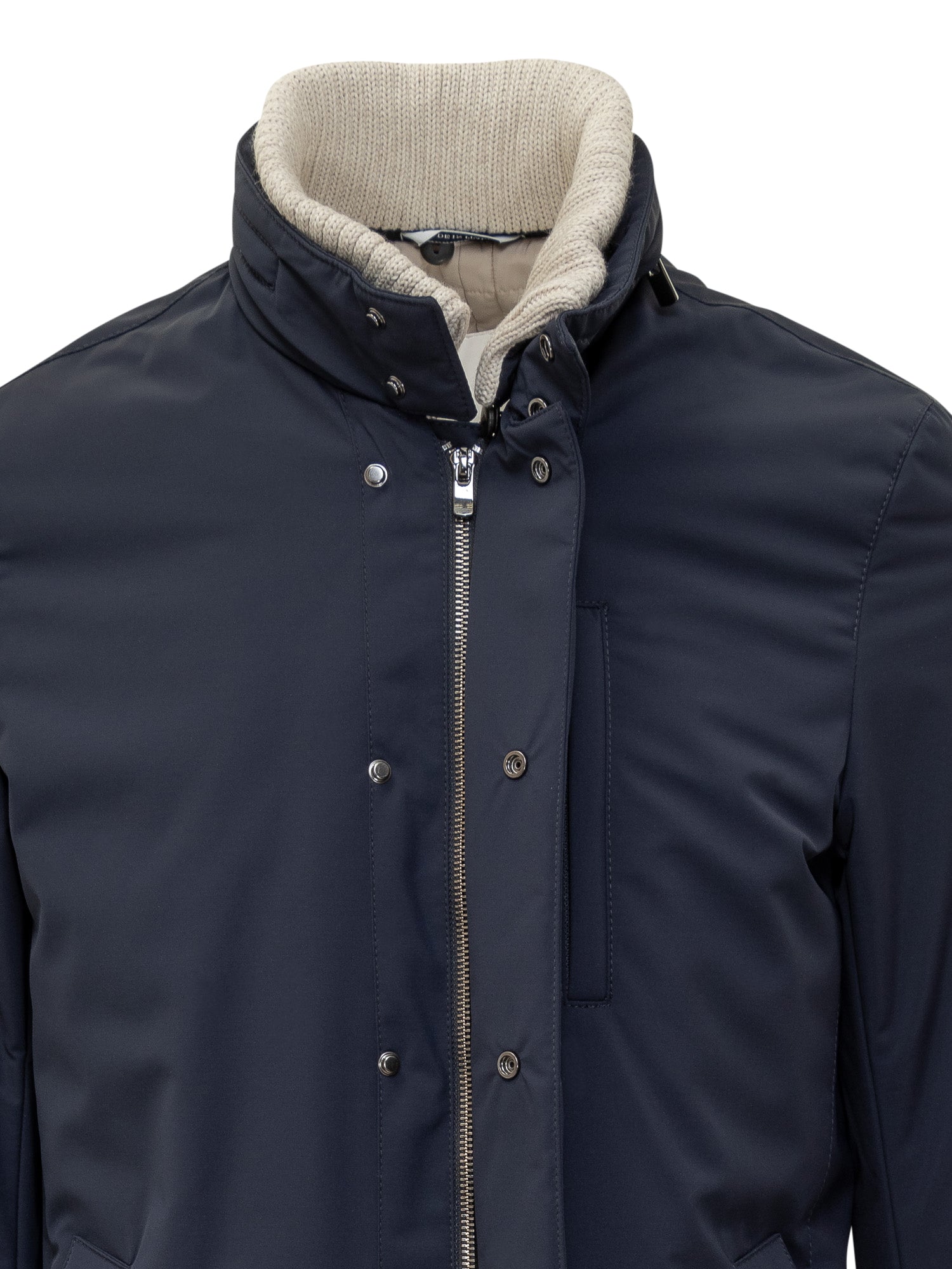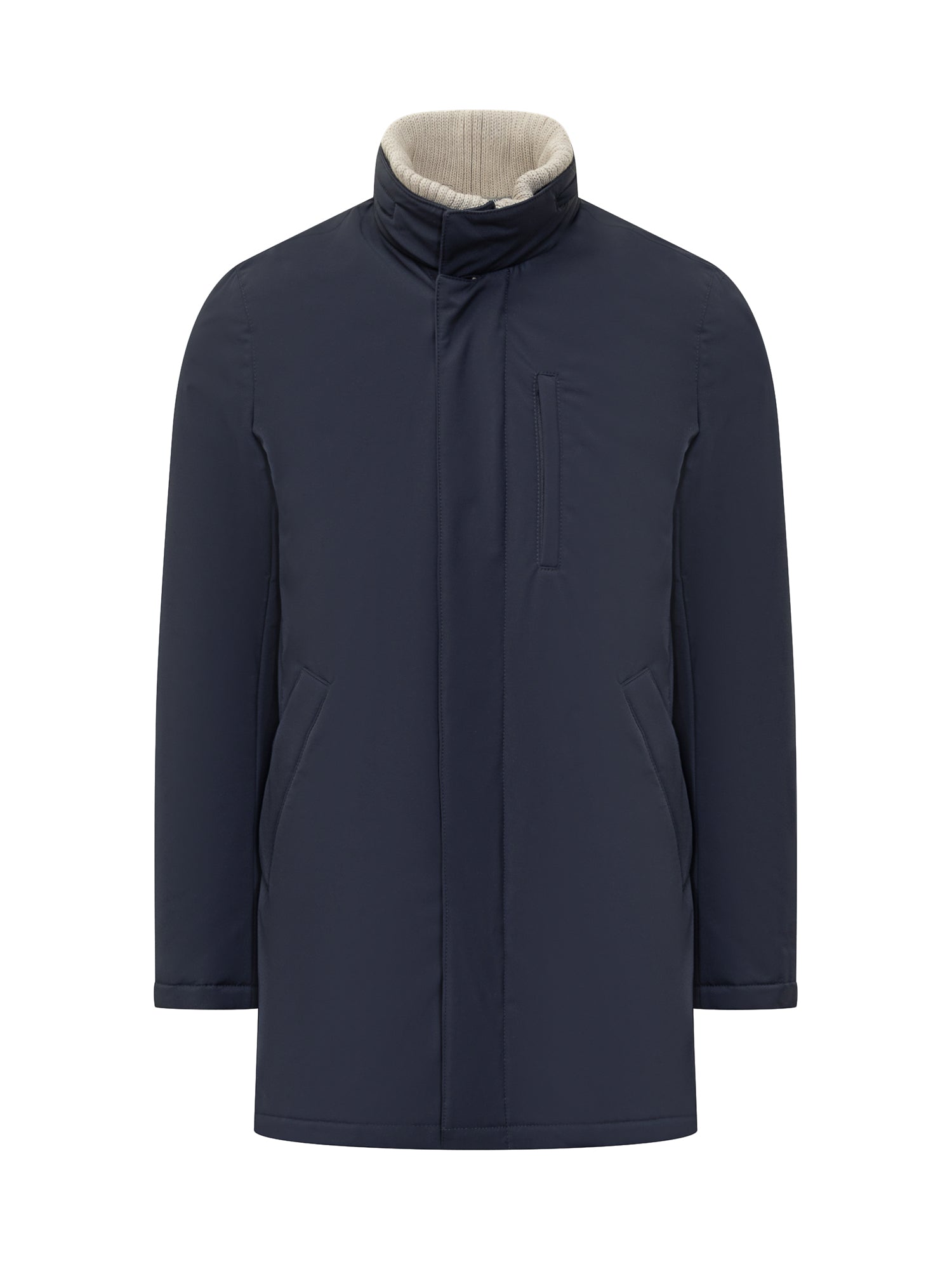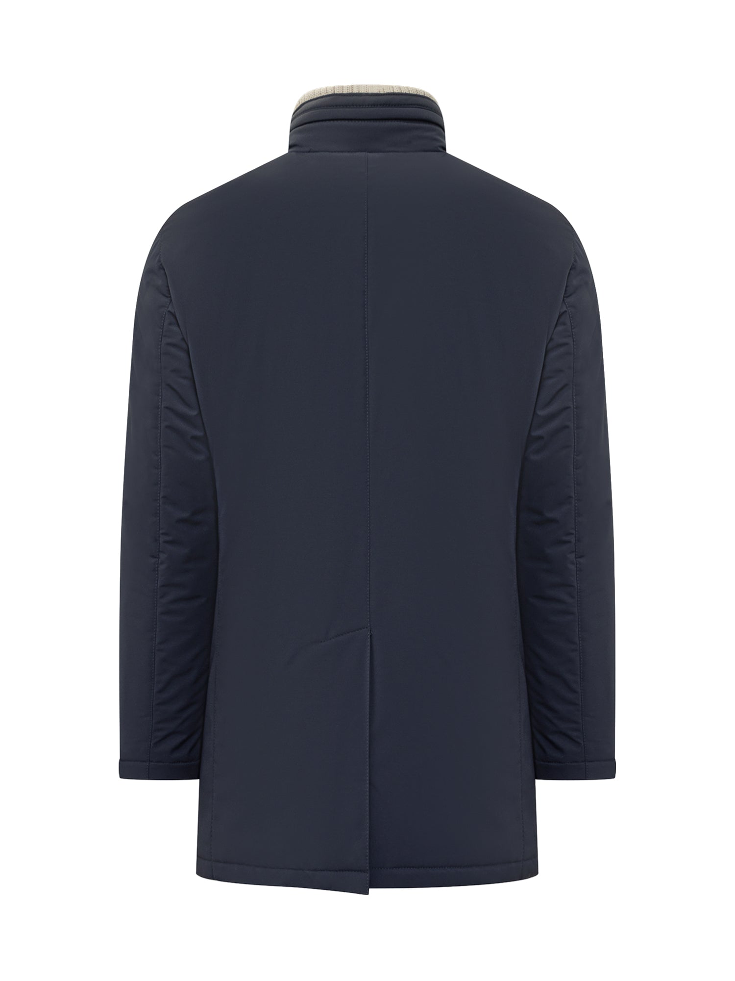 Esterno blue technical fabric coat with ribbed inner collar and hidden closure.