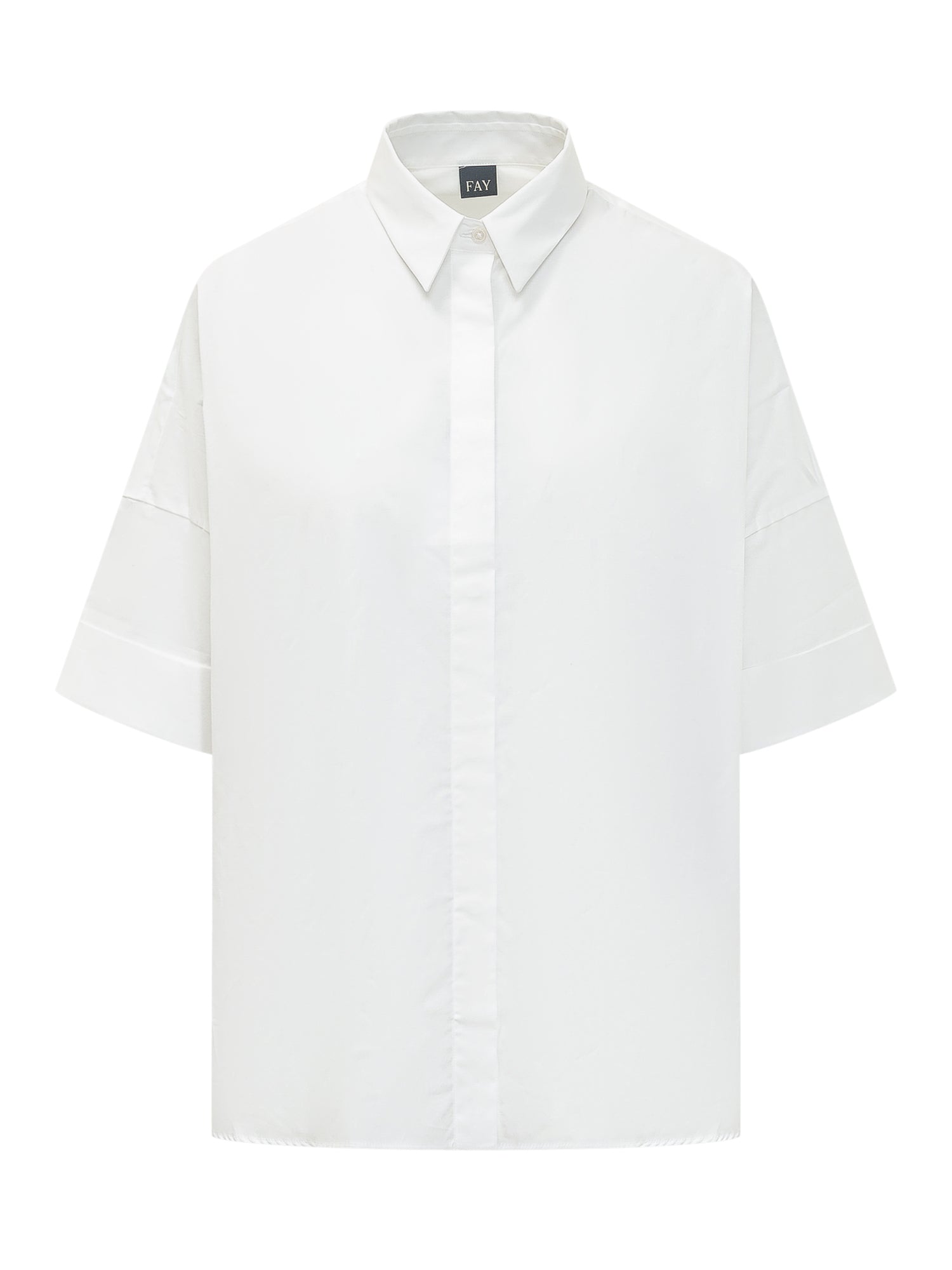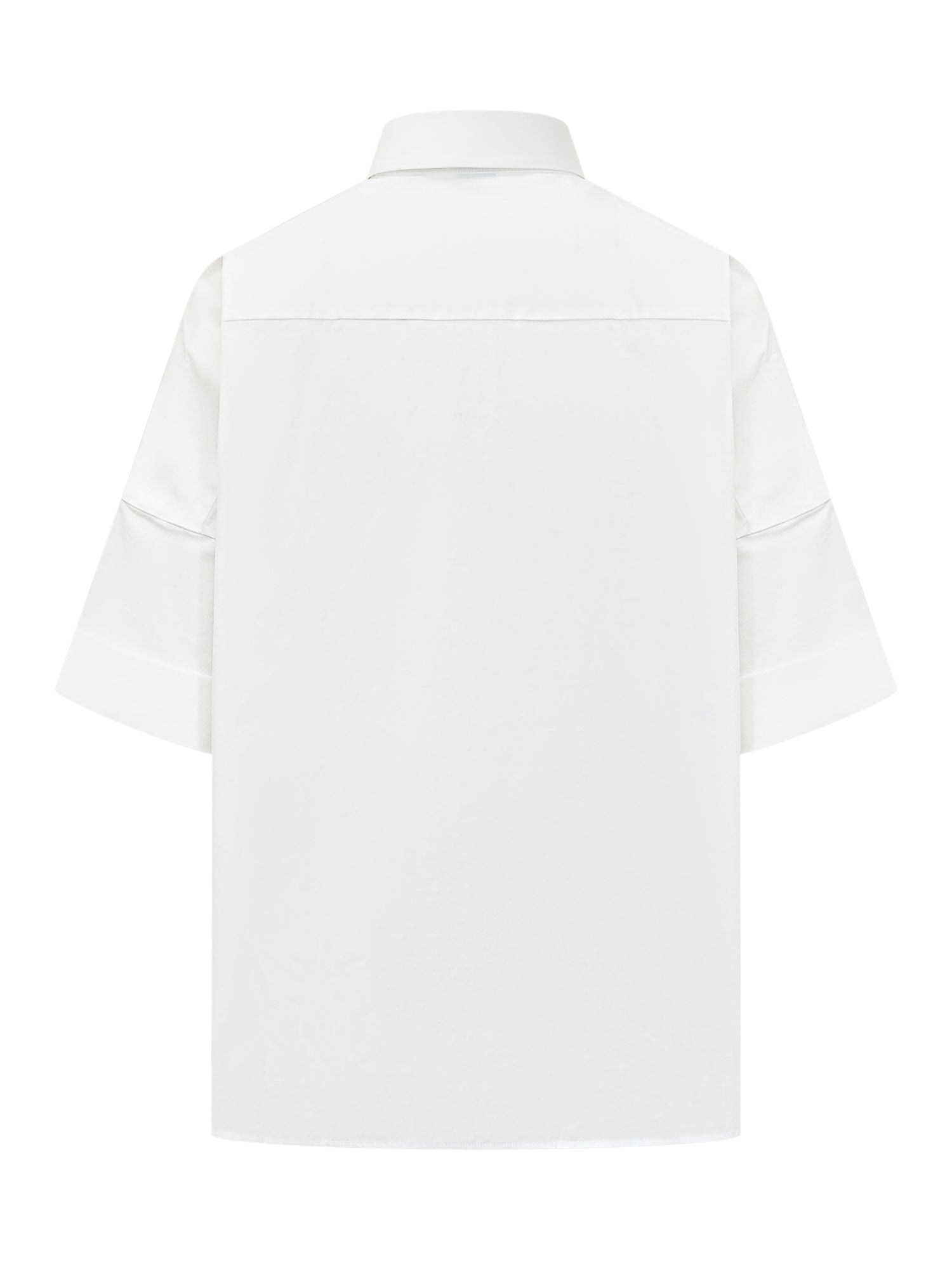 Minimal shirt with three-quarter sleeves. Boxy silhouette and clean design featuring classic collar and concealed front button closure.