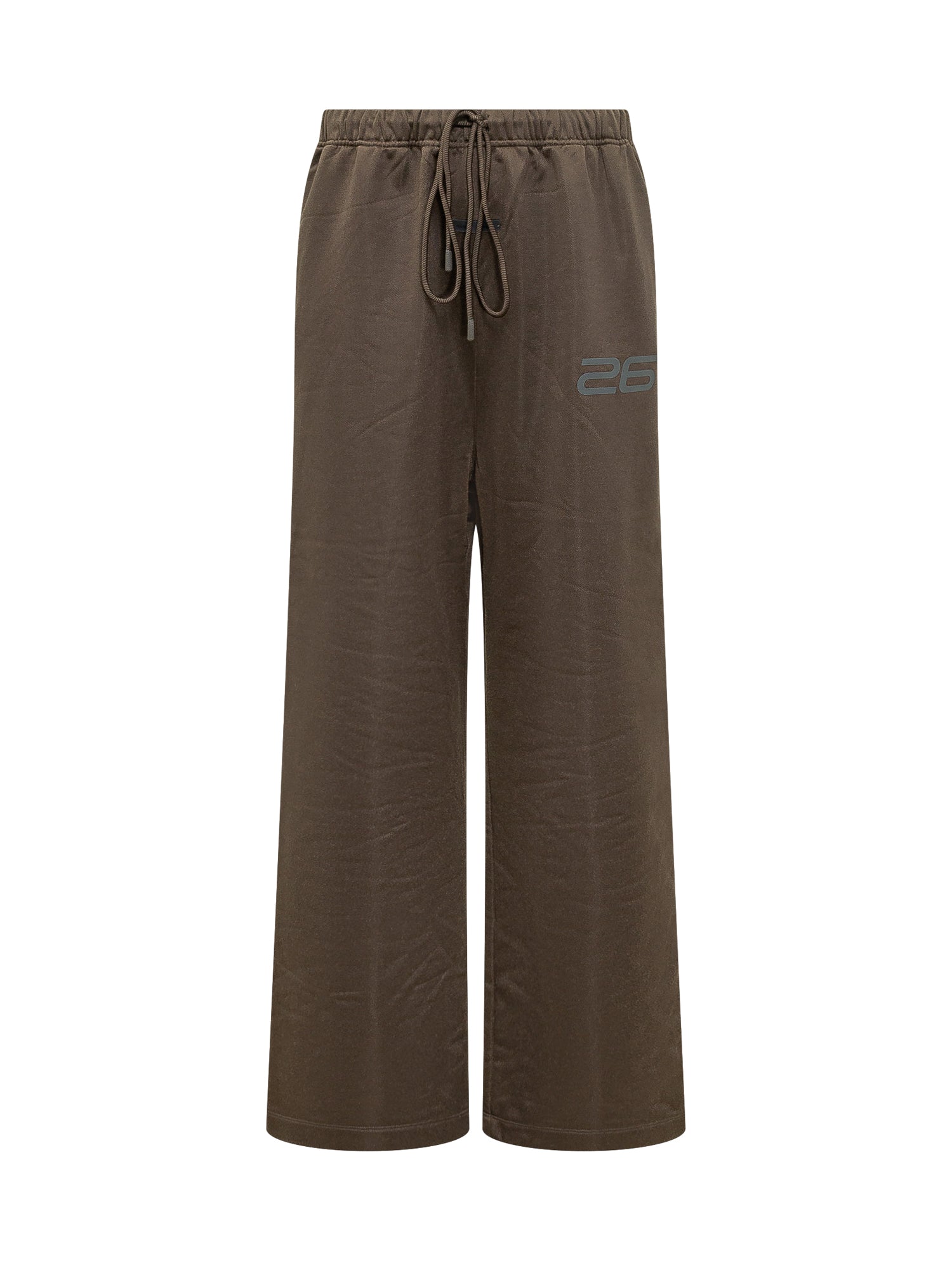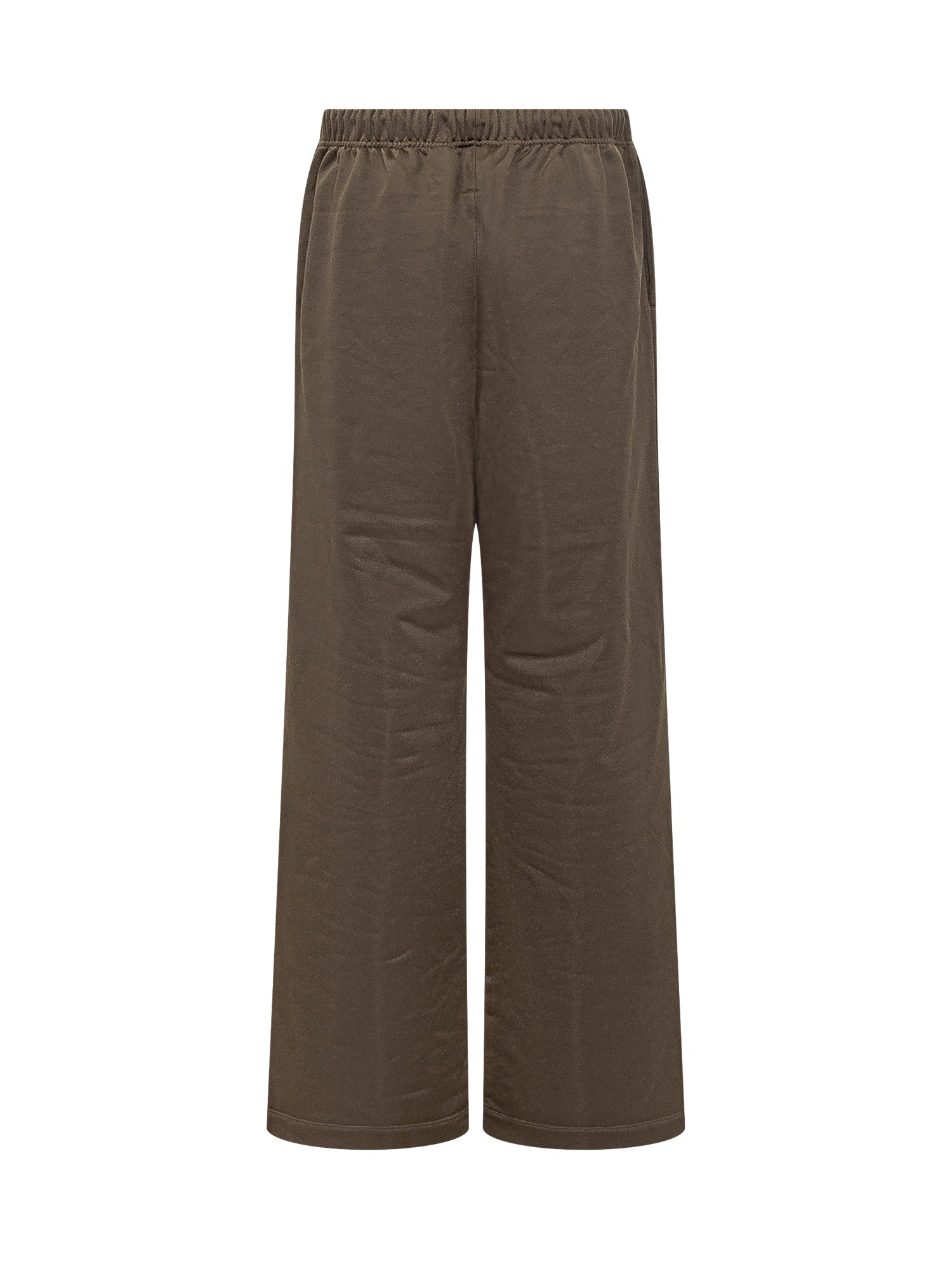 Brown lounge sweatpants made of soft fleece, featuring an elasticated waistband with adjustable drawstring closure. Relaxed fit with straight leg.