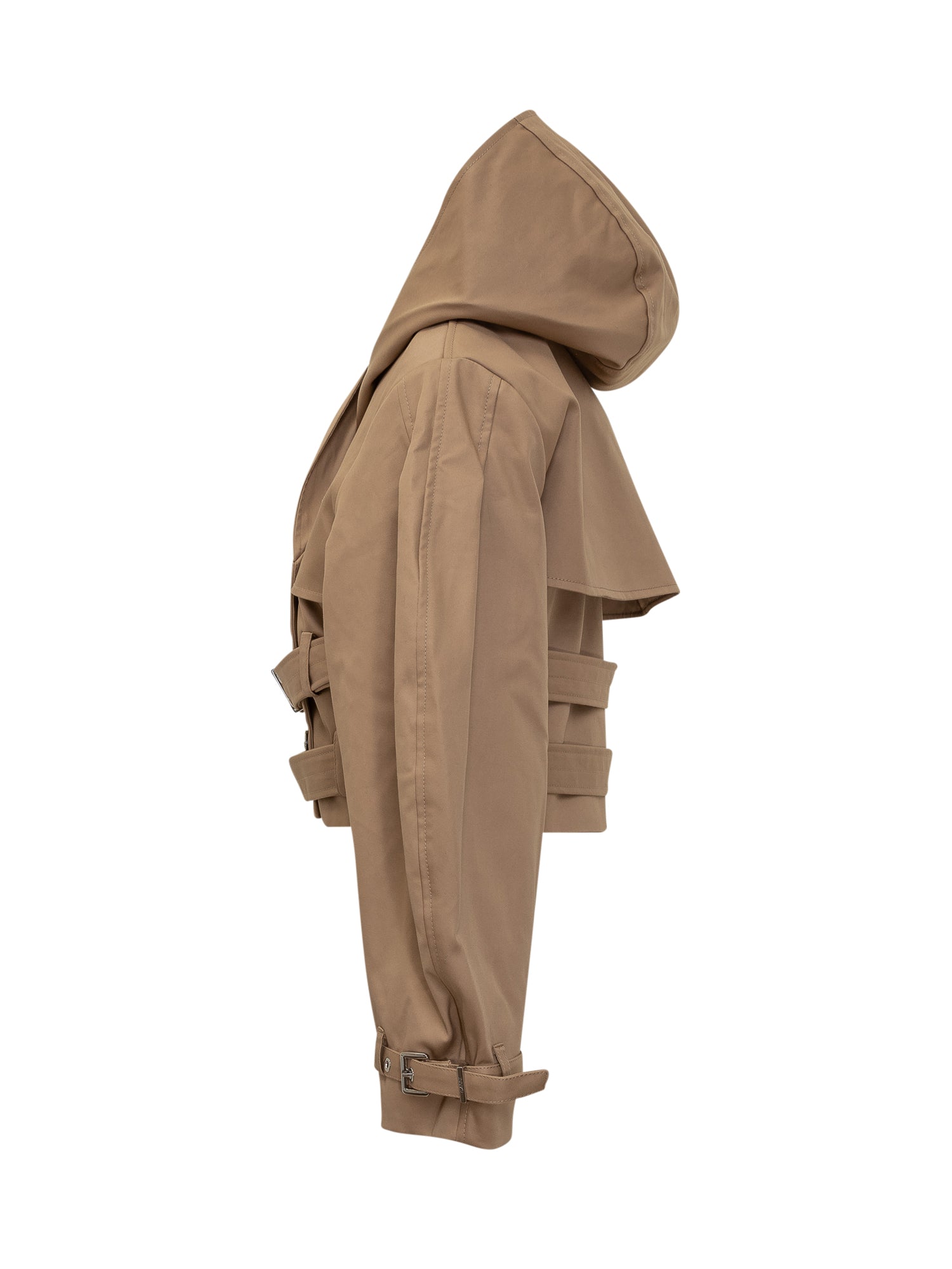 Structured cropped jacket with a wrapped front and multiple adjustable straps enhancing the silhouette. Features a wide hood and metallic details.