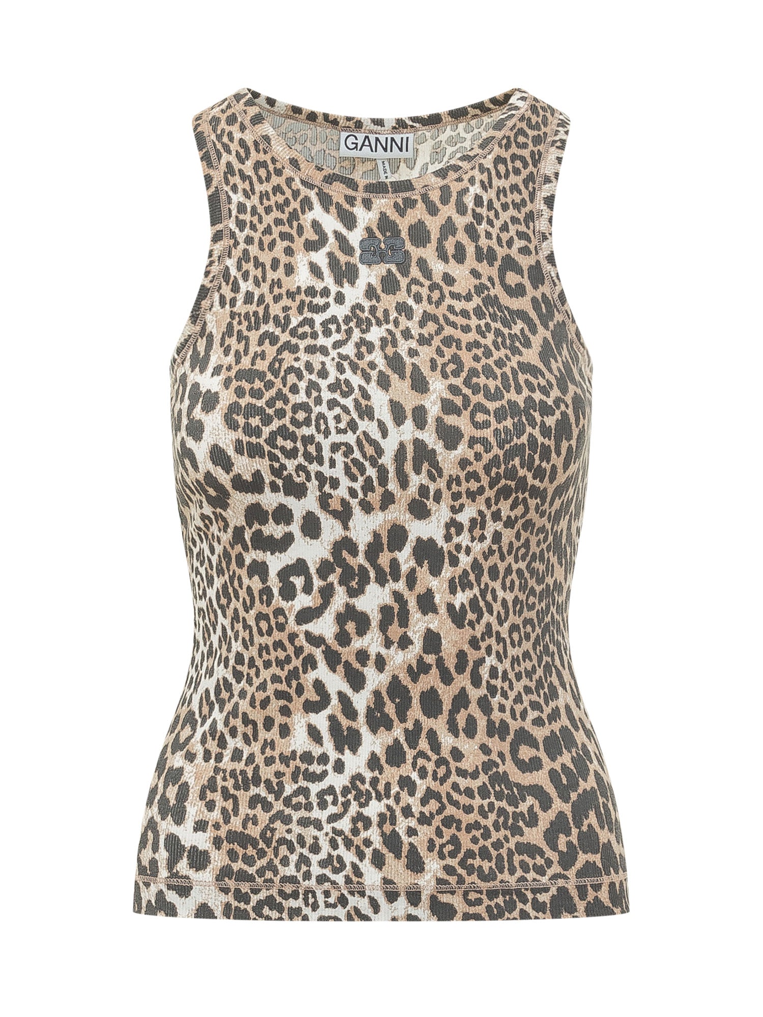 Soft cotton tank top featuring an all over animal print and a fitted silhouette. A clean, versatile design that enhances the figure.