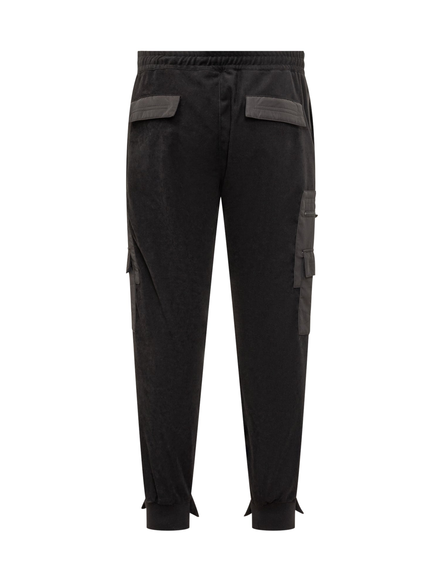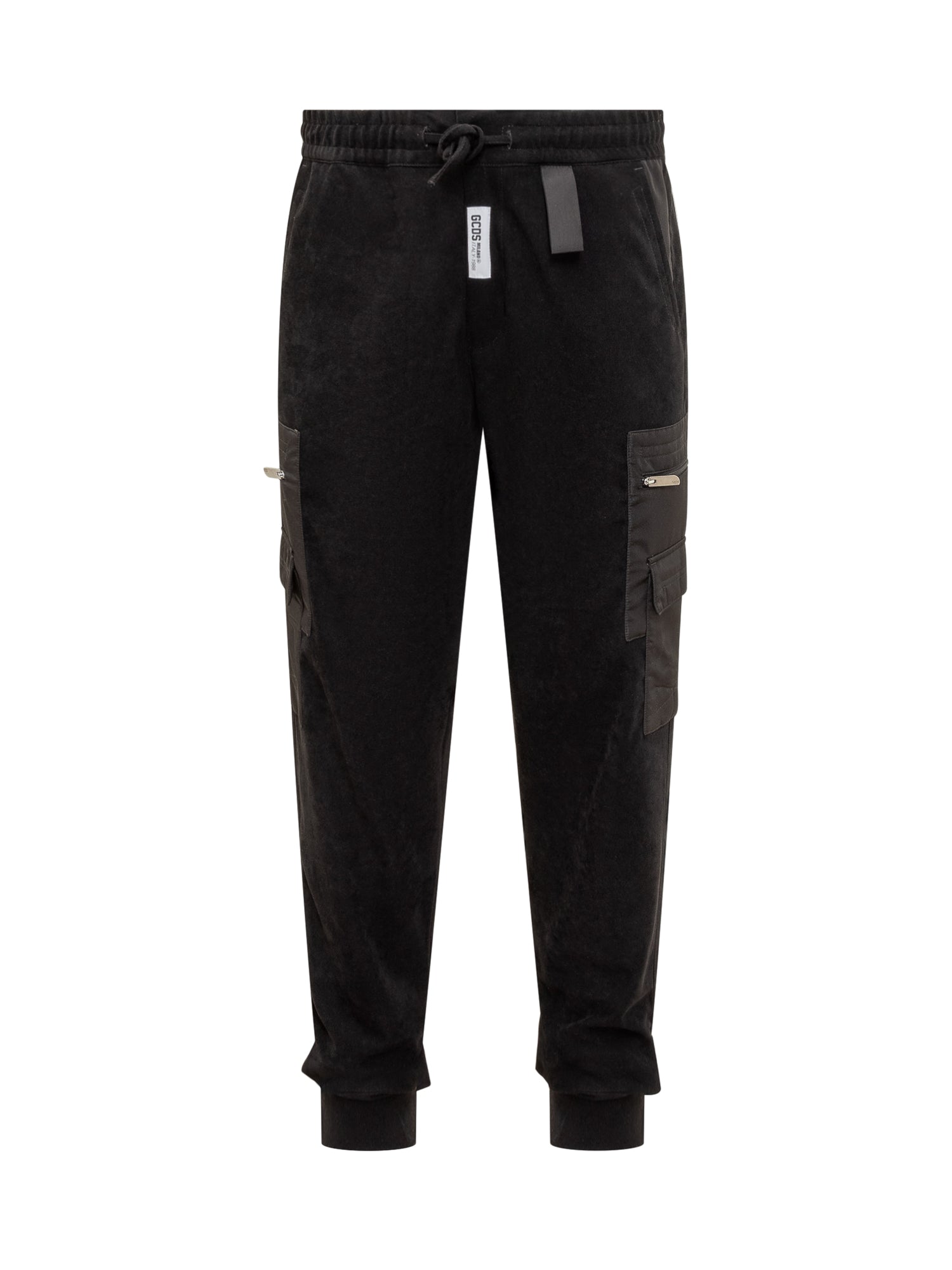 GCDS jogger pants in black velvet with cargo pockets, elastic waistband with drawstring, and button and zip closure.