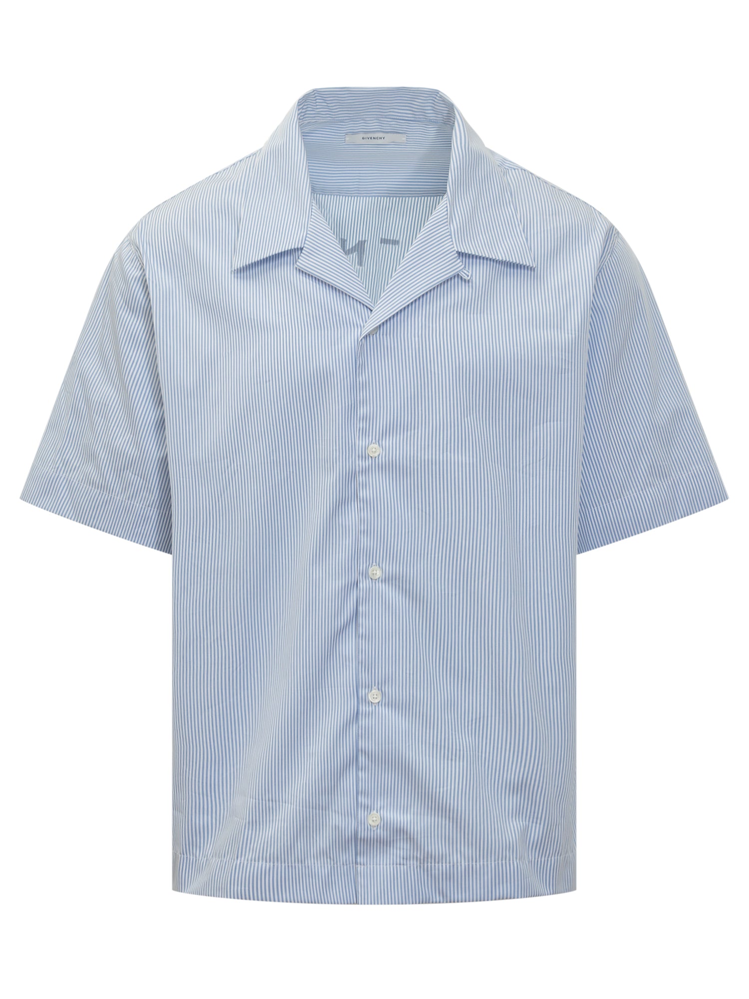 Givenchy short-sleeved shirt with blue and white stripes, Cuban collar, and front button closure.