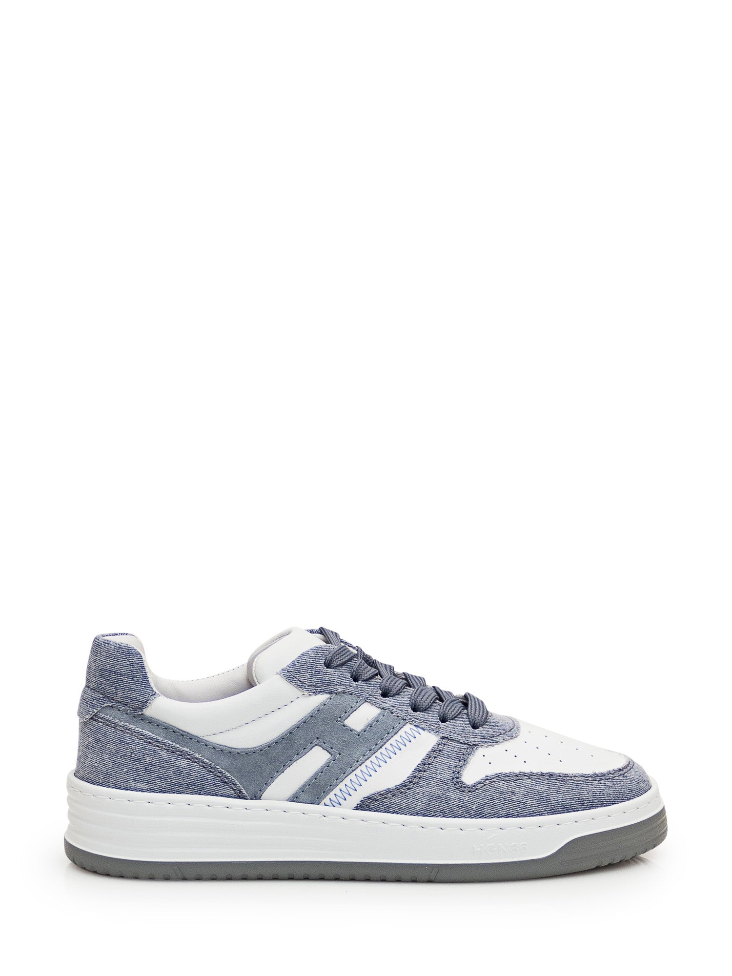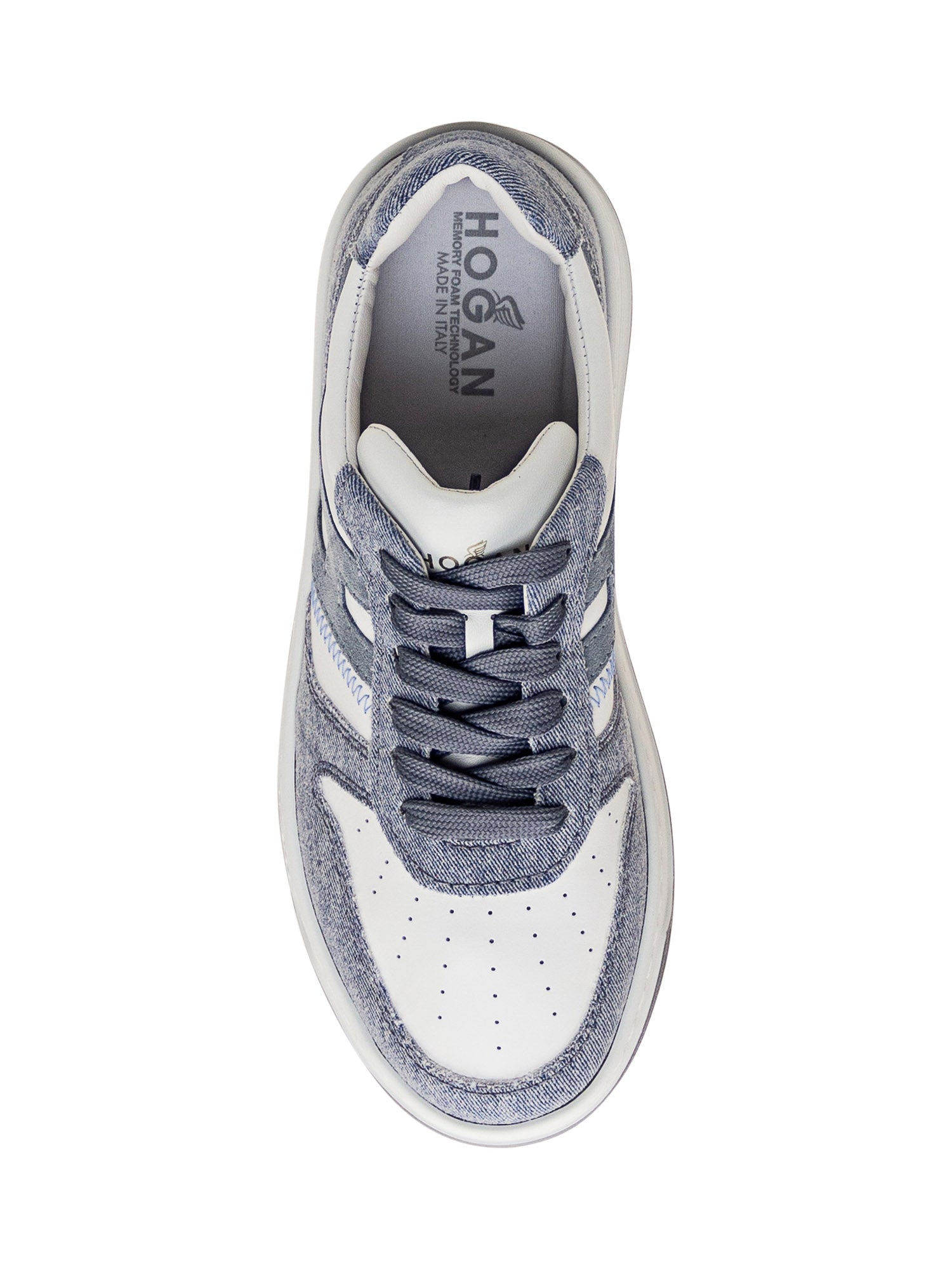 White leather Sneaker with denim fabric inserts. Perforated toe. Closure with laces. Logo printed on the tongue.