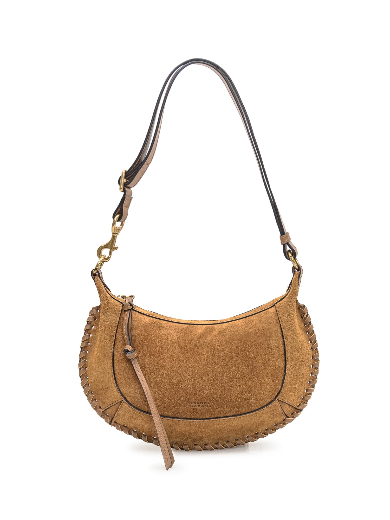 Suede shoulder bag with a crescent shape and braided edge details. Features an adjustable strap and top zip closure.Size: 12.20x7.09x3.94