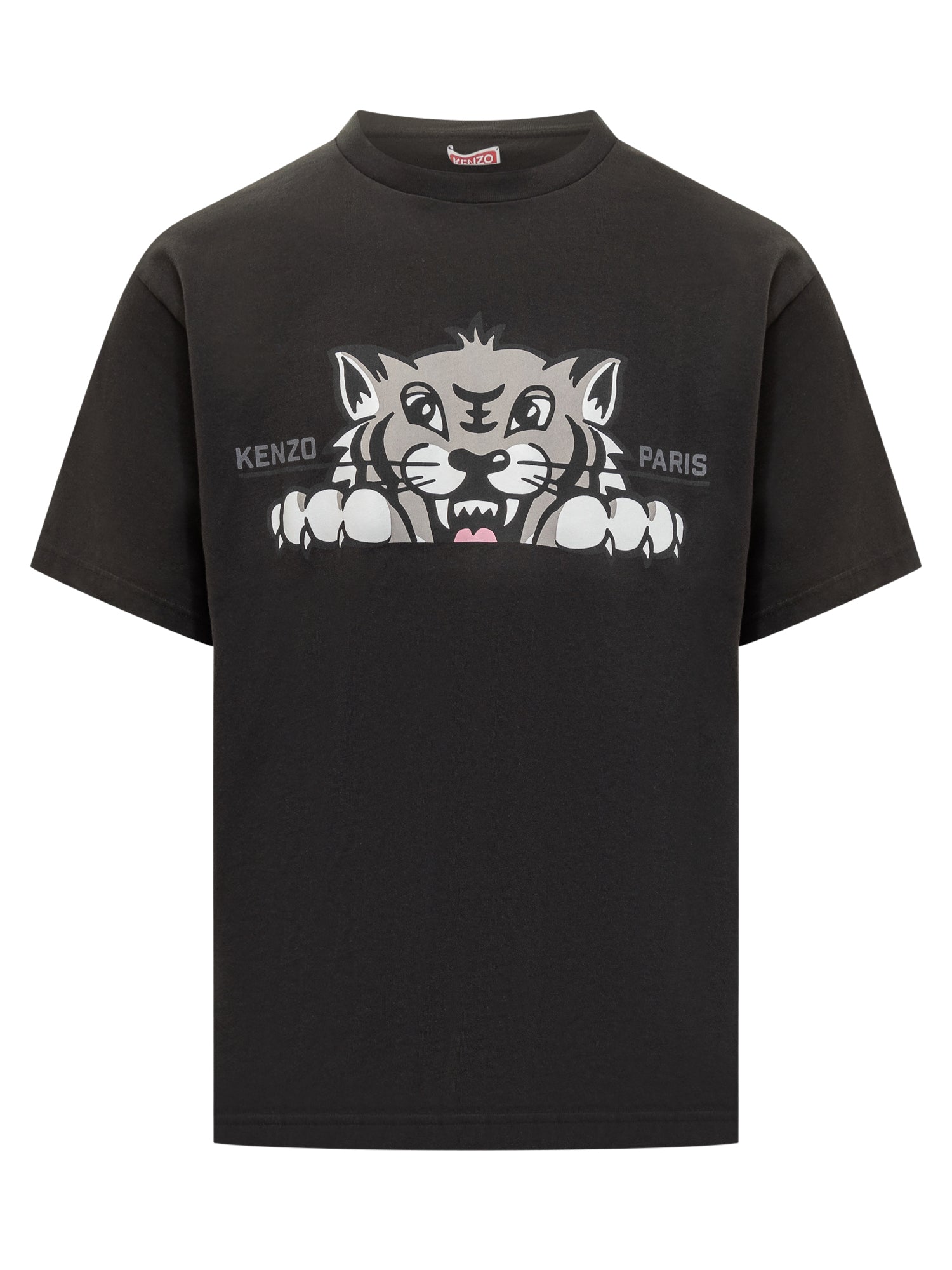 Kenzo black cotton T-shirt featuring the iconic tiger print and Paris lettering on the front. Casual fit with a bold graphic design.