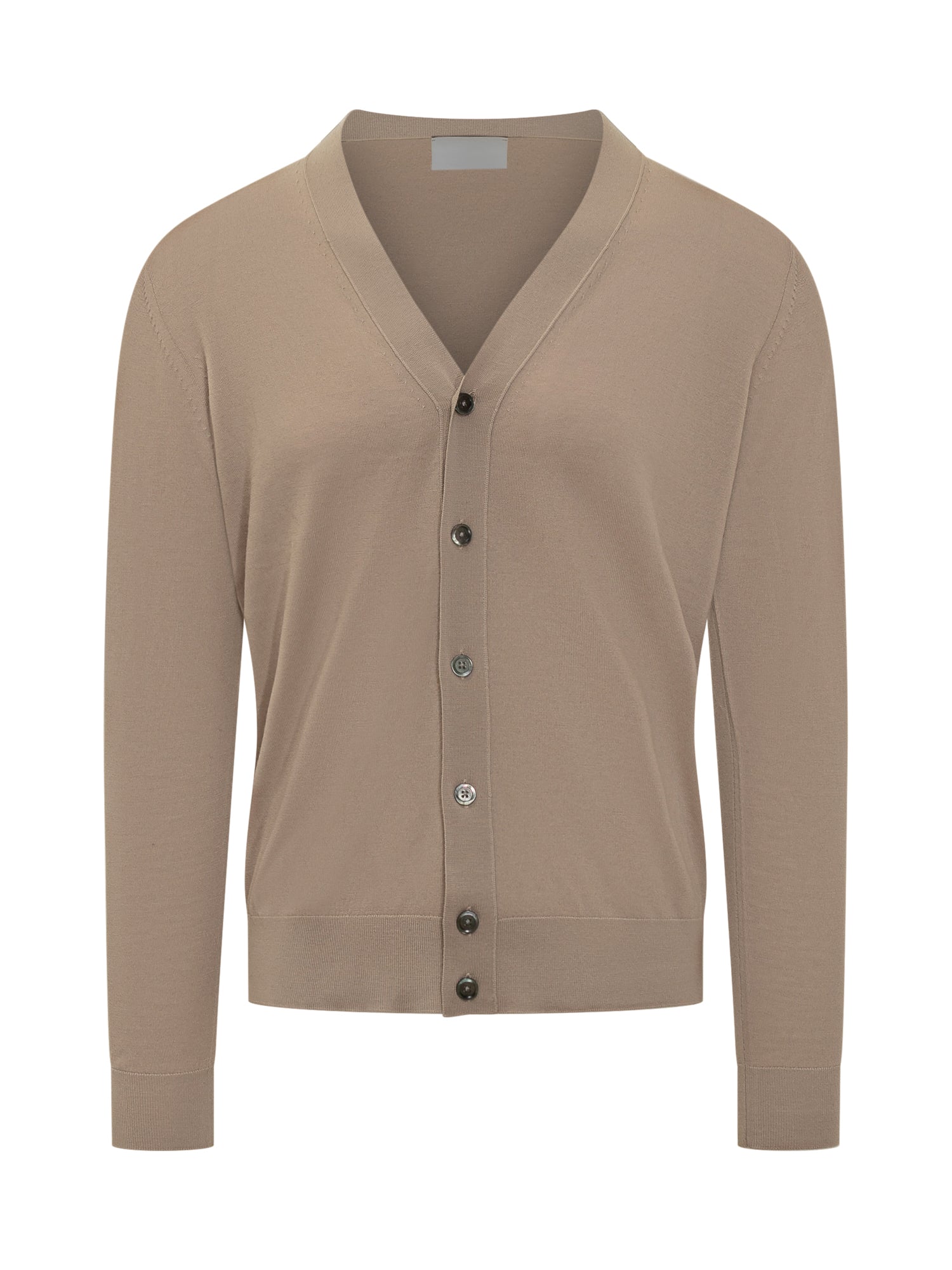 Knit De Monsieur lightweight beige cardigan with V-neck and button closure.