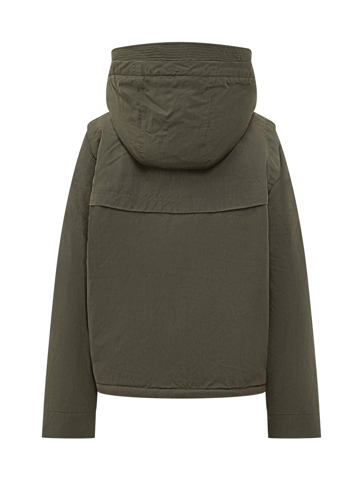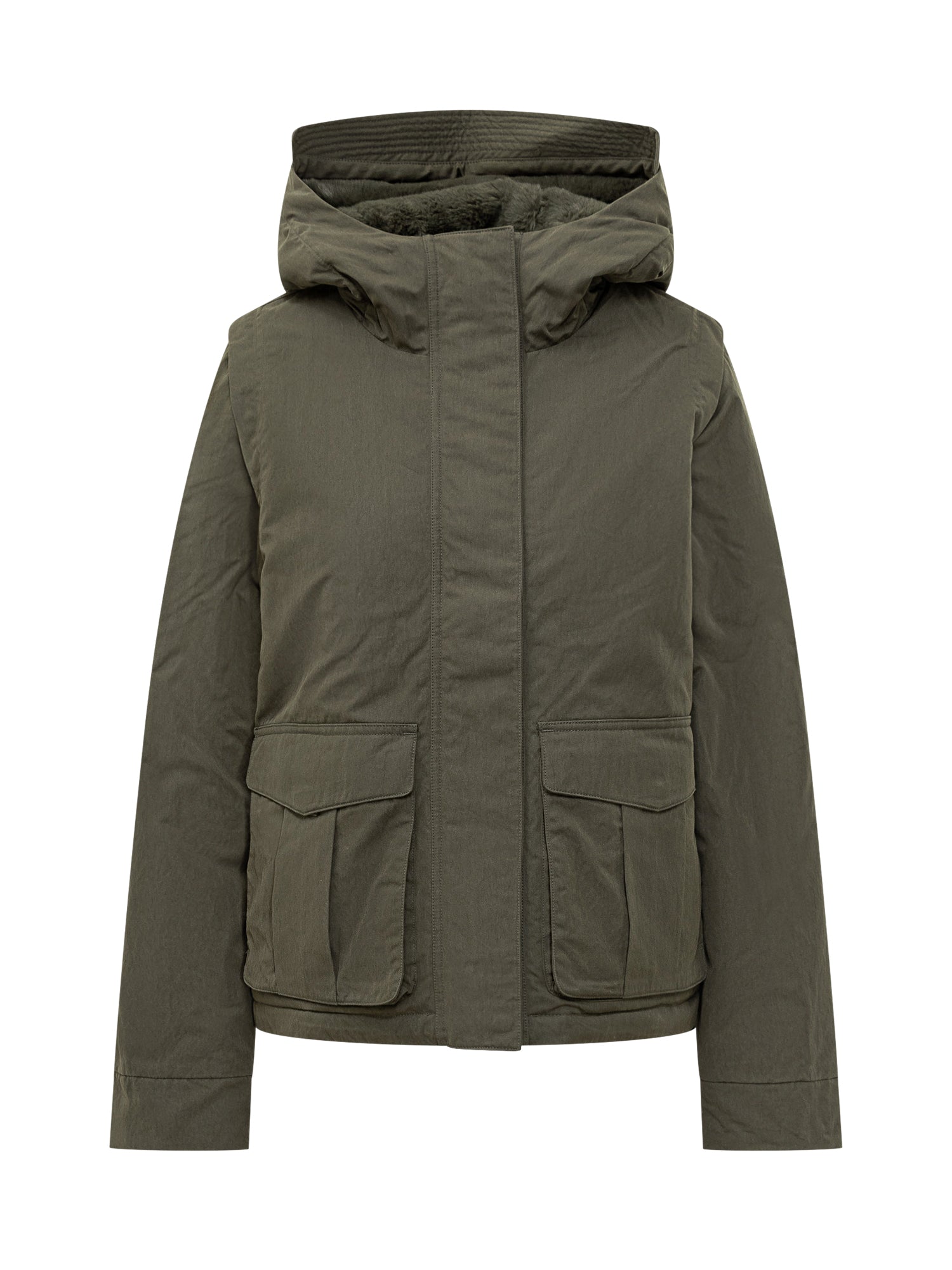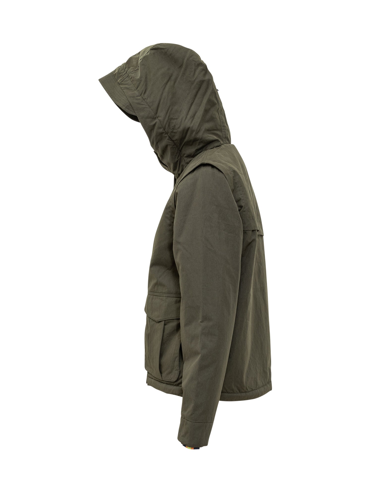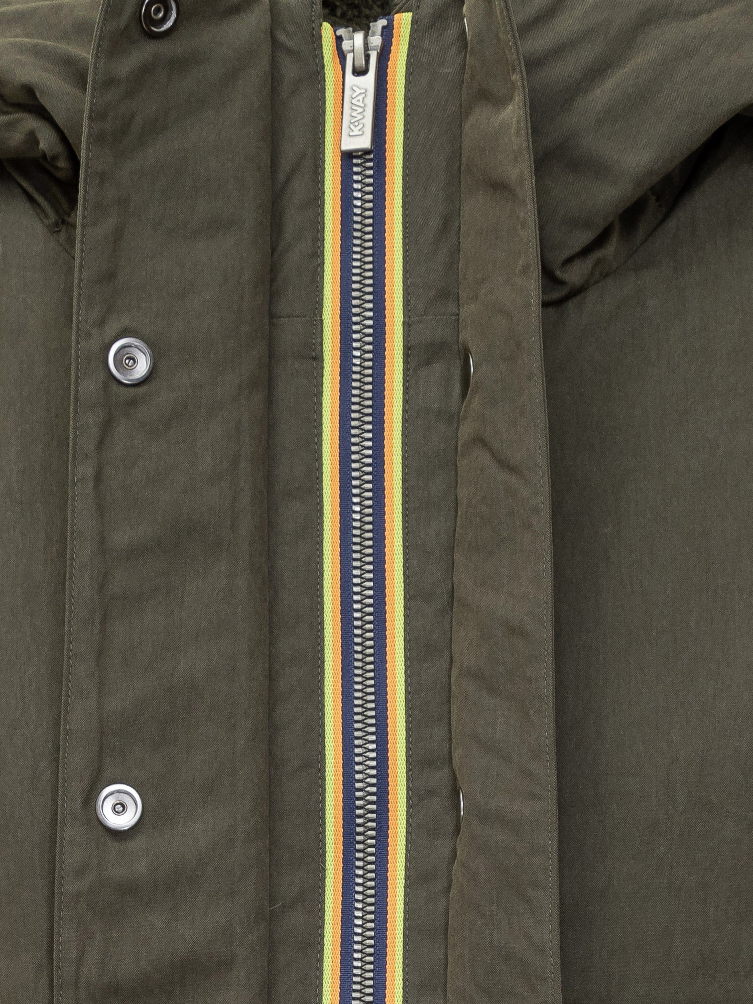 K-Way military green hooded jacket with soft faux fur lining. Features zip and flap closure, front patch pockets.
