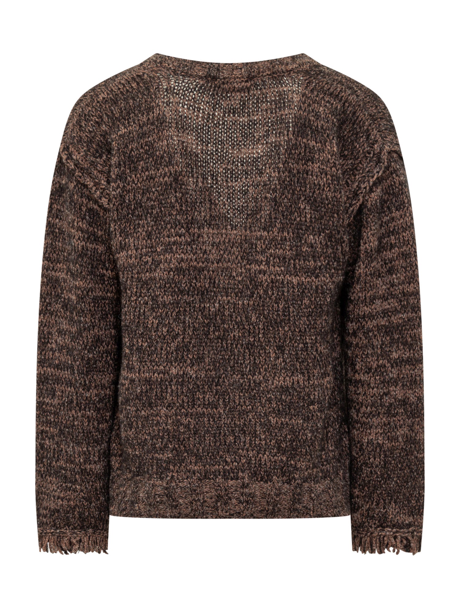 Laneus brown mélange knit cardigan with front buttons and frayed hems.