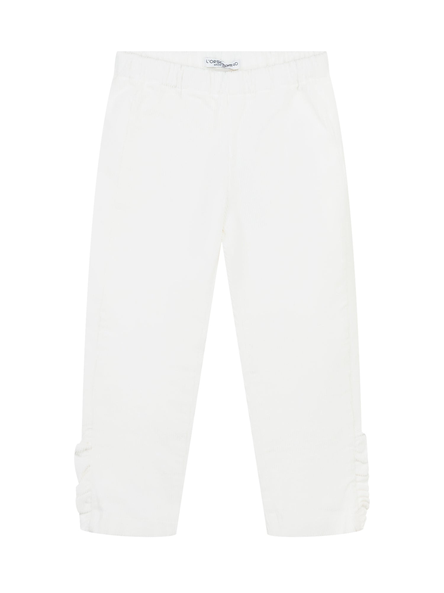 L Orso Bruno white corduroy pants with elastic waist and ruched ankle details.
