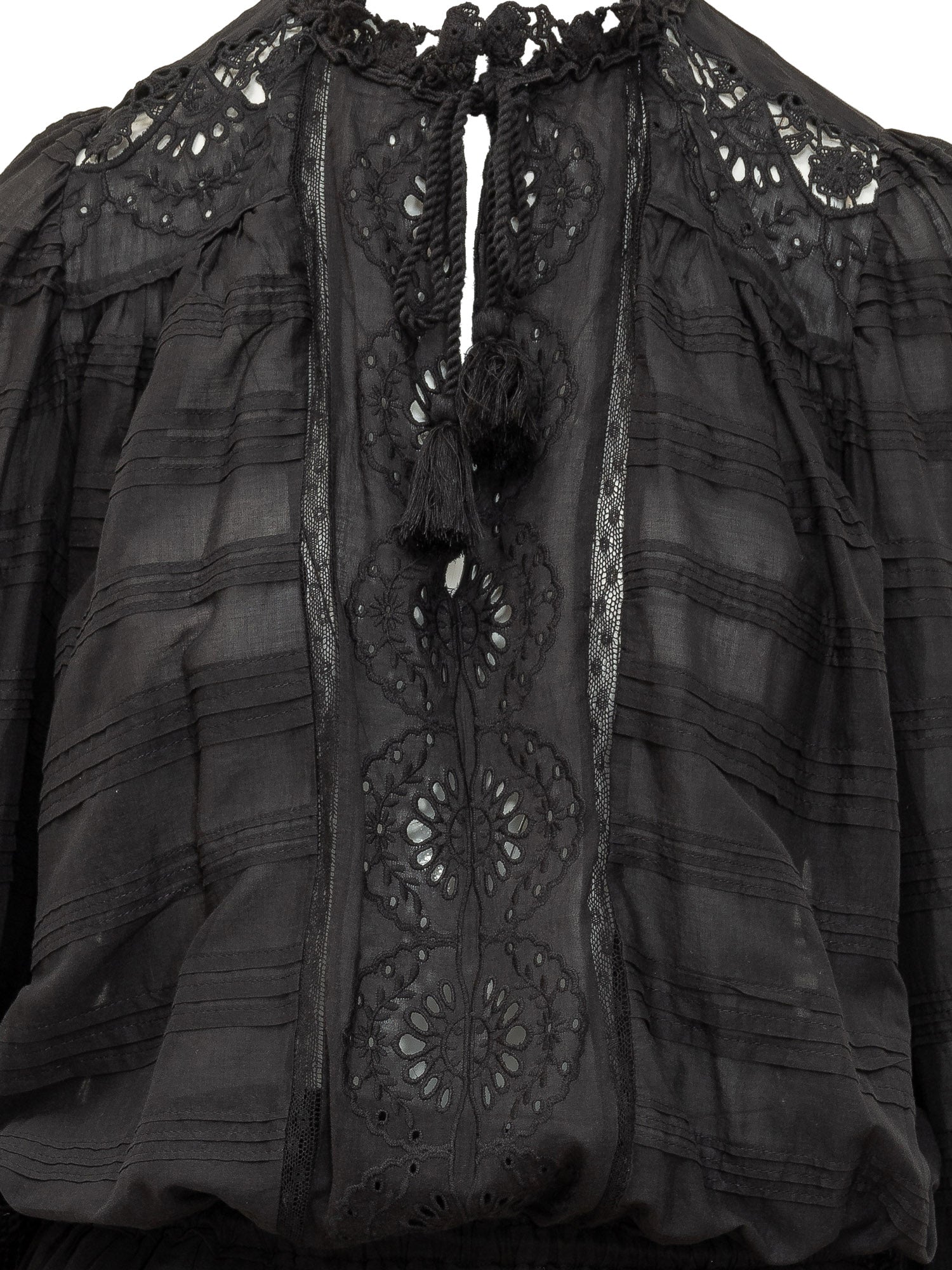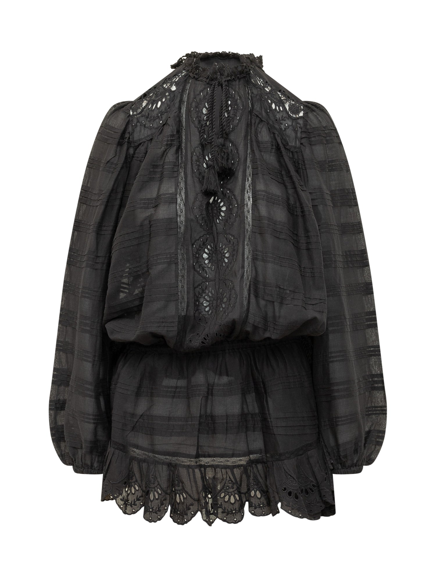 Long sleeve short dress with gathered neckline and elasticated waist. All over embroidery and ruffled hem add detail.