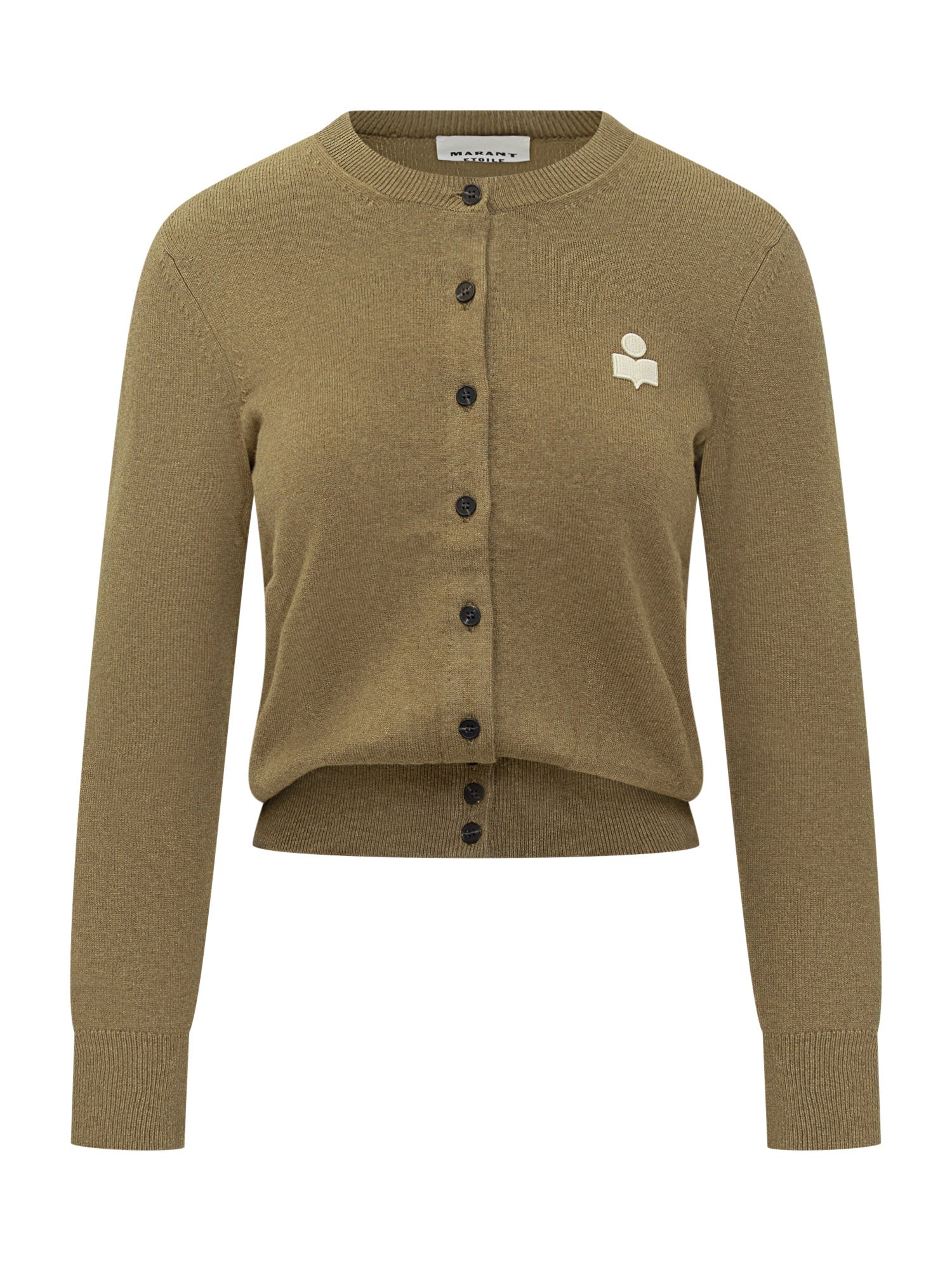 Marant Étoile green lightweight knit cardigan with front buttons and embroidered logo on the chest.