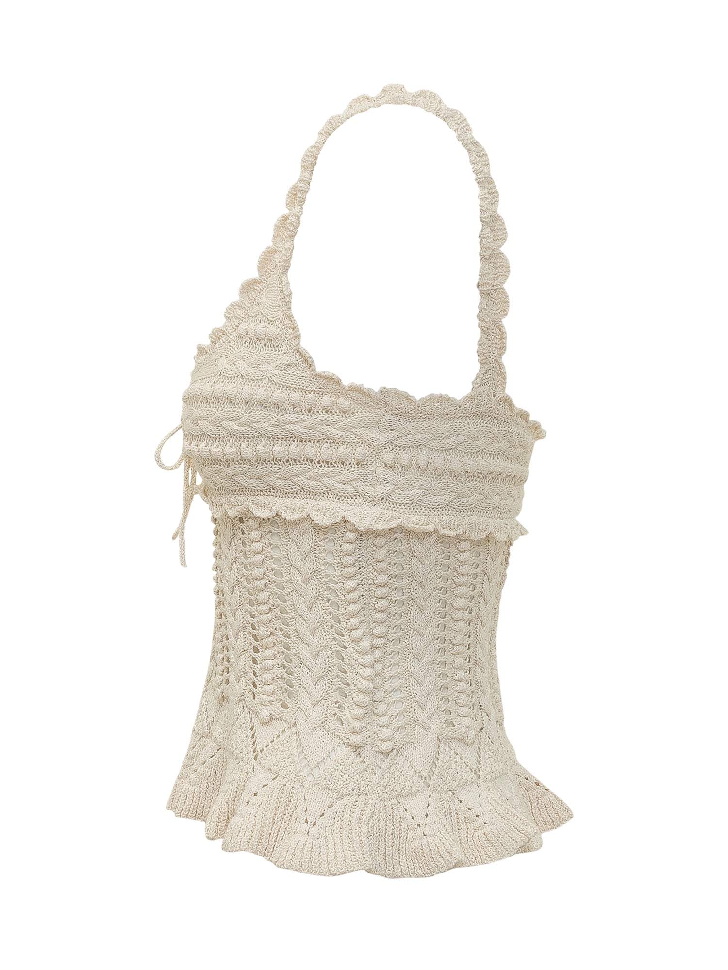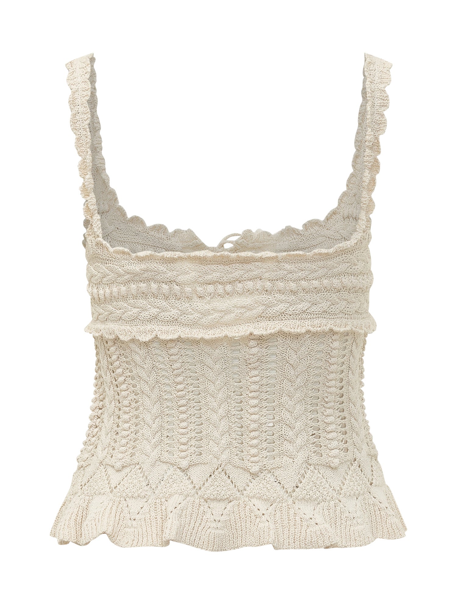 Knitted top with vertical openwork pattern, wide straps and front tie neckline, ribbed ruffle hem, fitted silhouette ideal for feminine and refined looks.