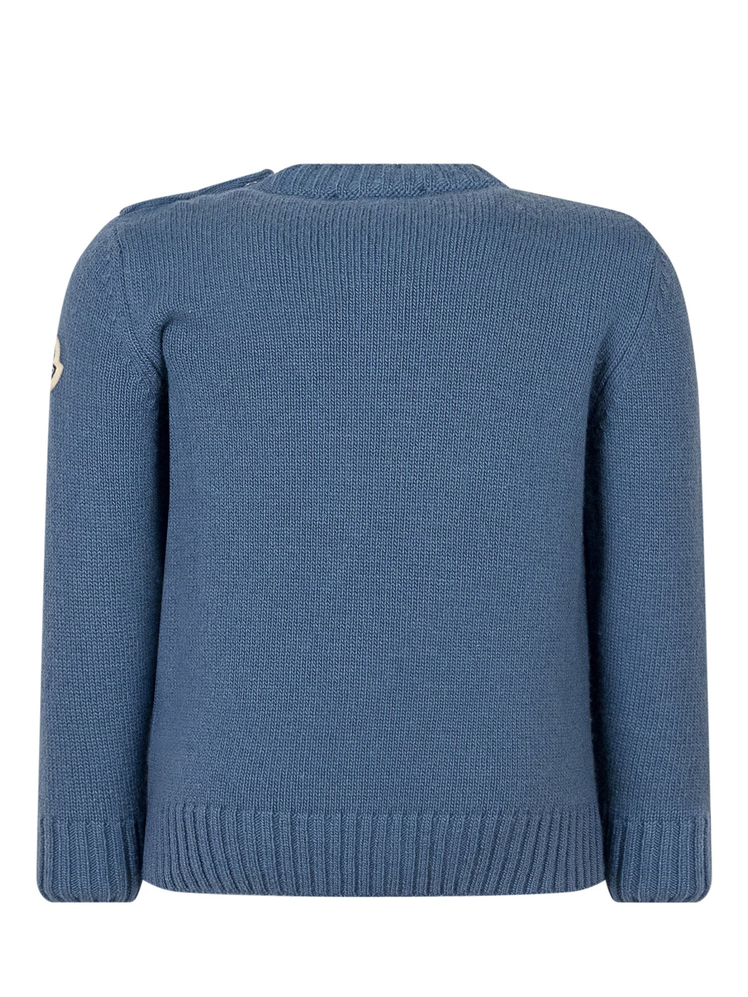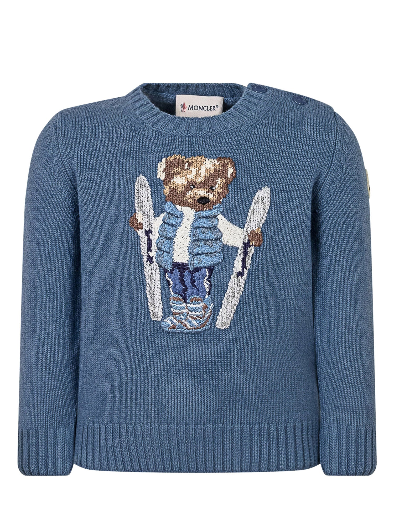 Moncler Kids blue sweater featuring a ski bear motif on the front.