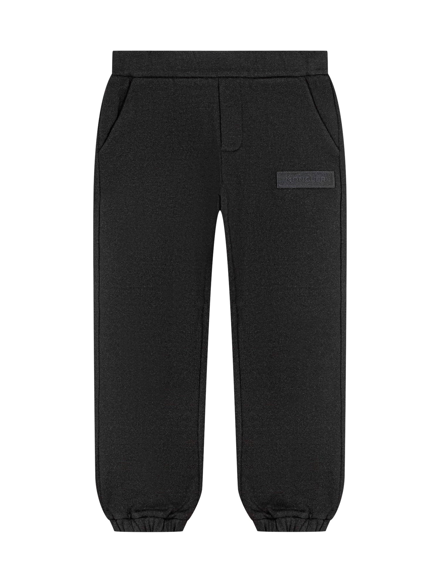 Black fleece pants with elastic waist and ankle cuffs. Moncler embroidered logo on the side.