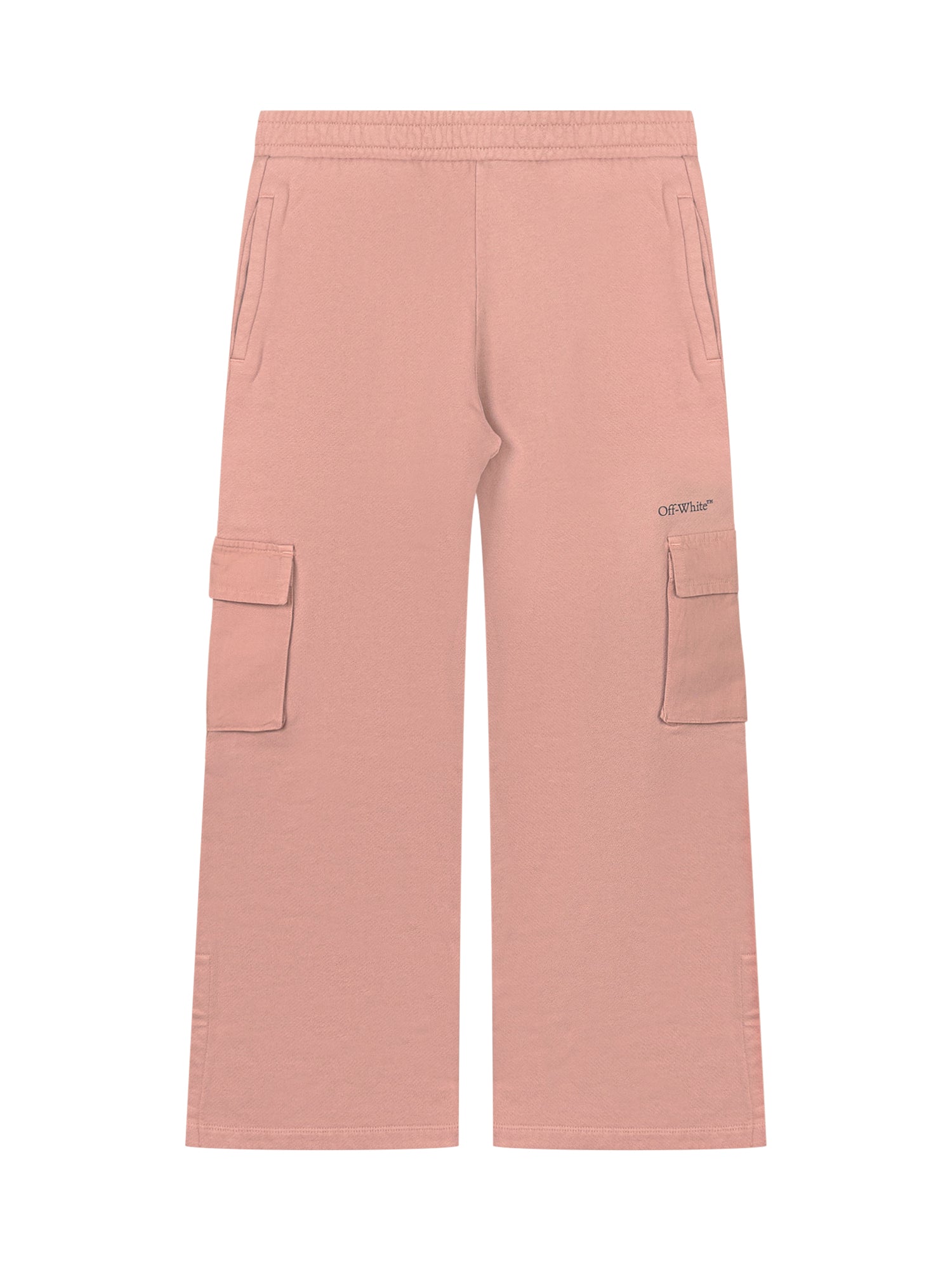Off-White pink cotton cargo pants with side pockets and embroidered logo. Wide relaxed fit.