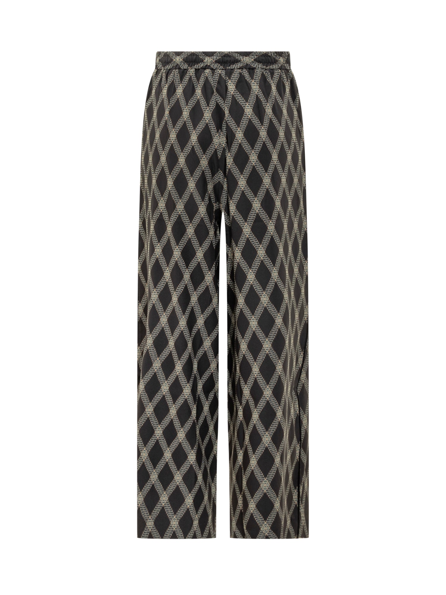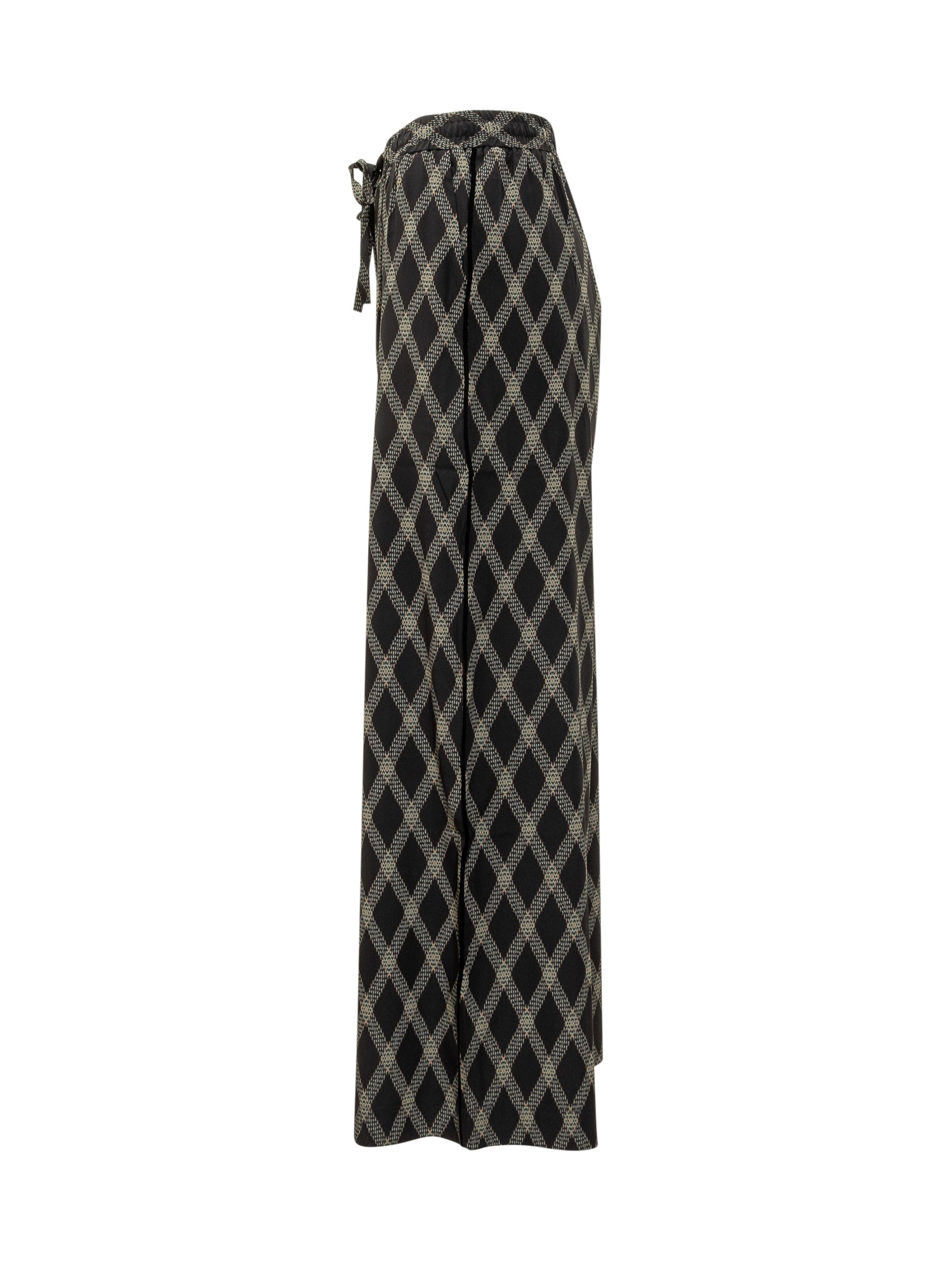 Wide-leg silk pants with diamond print and adjustable drawstring waist.