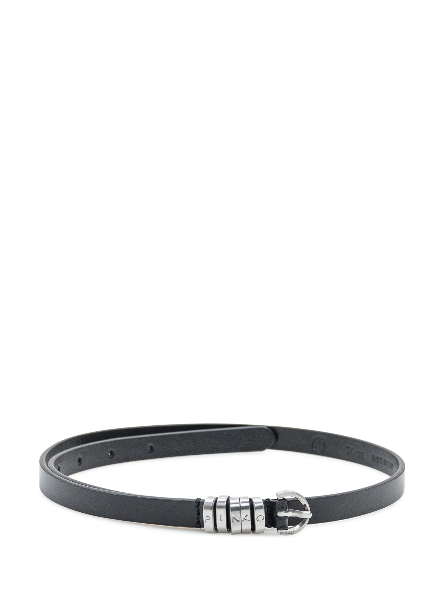 Pinko black leather belt with silver buckle and metallic loops engraved with logo letters.