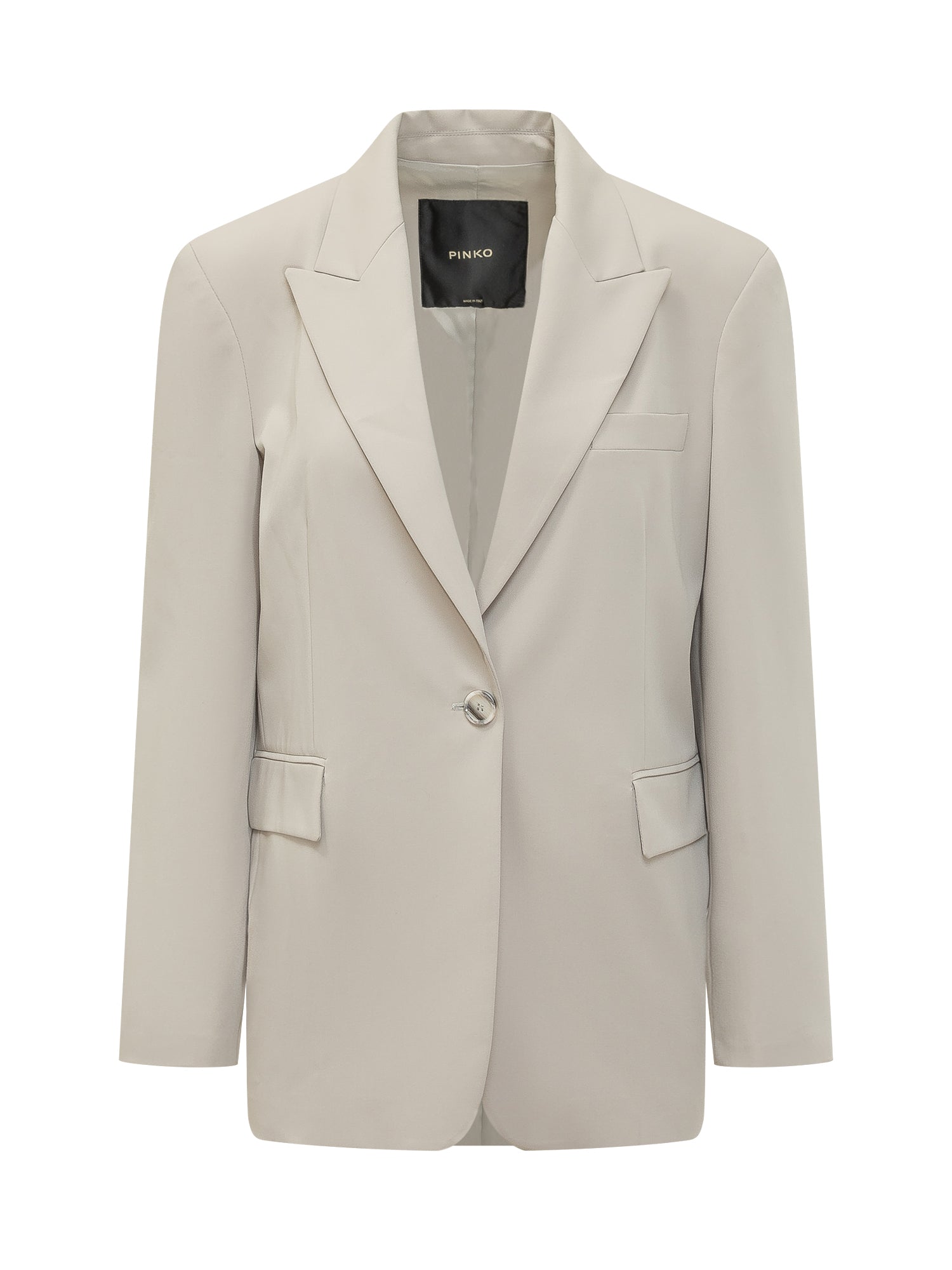 Womens tailored jacket with wide lapels, button closure, flap pockets and chest welt pocket.