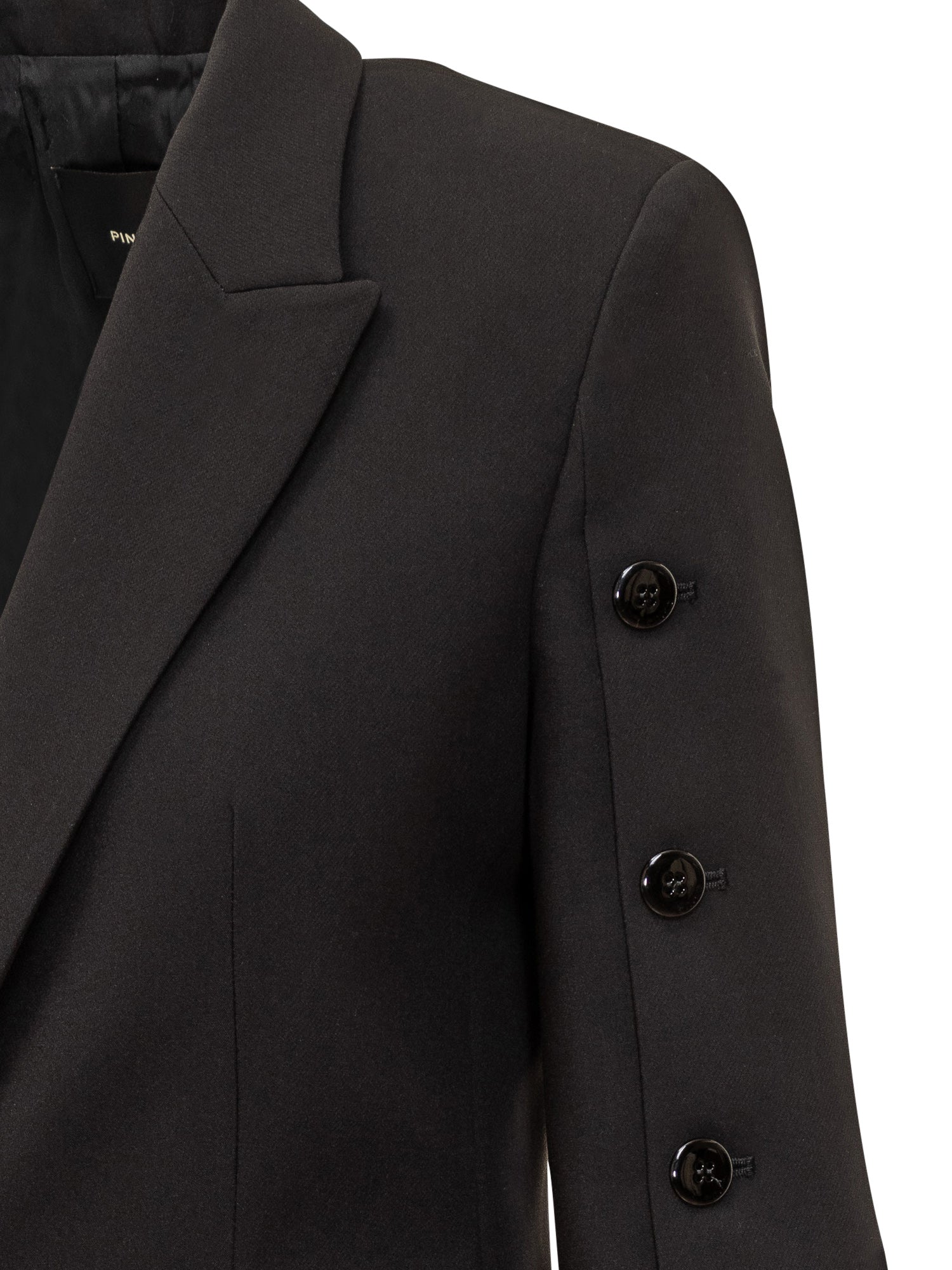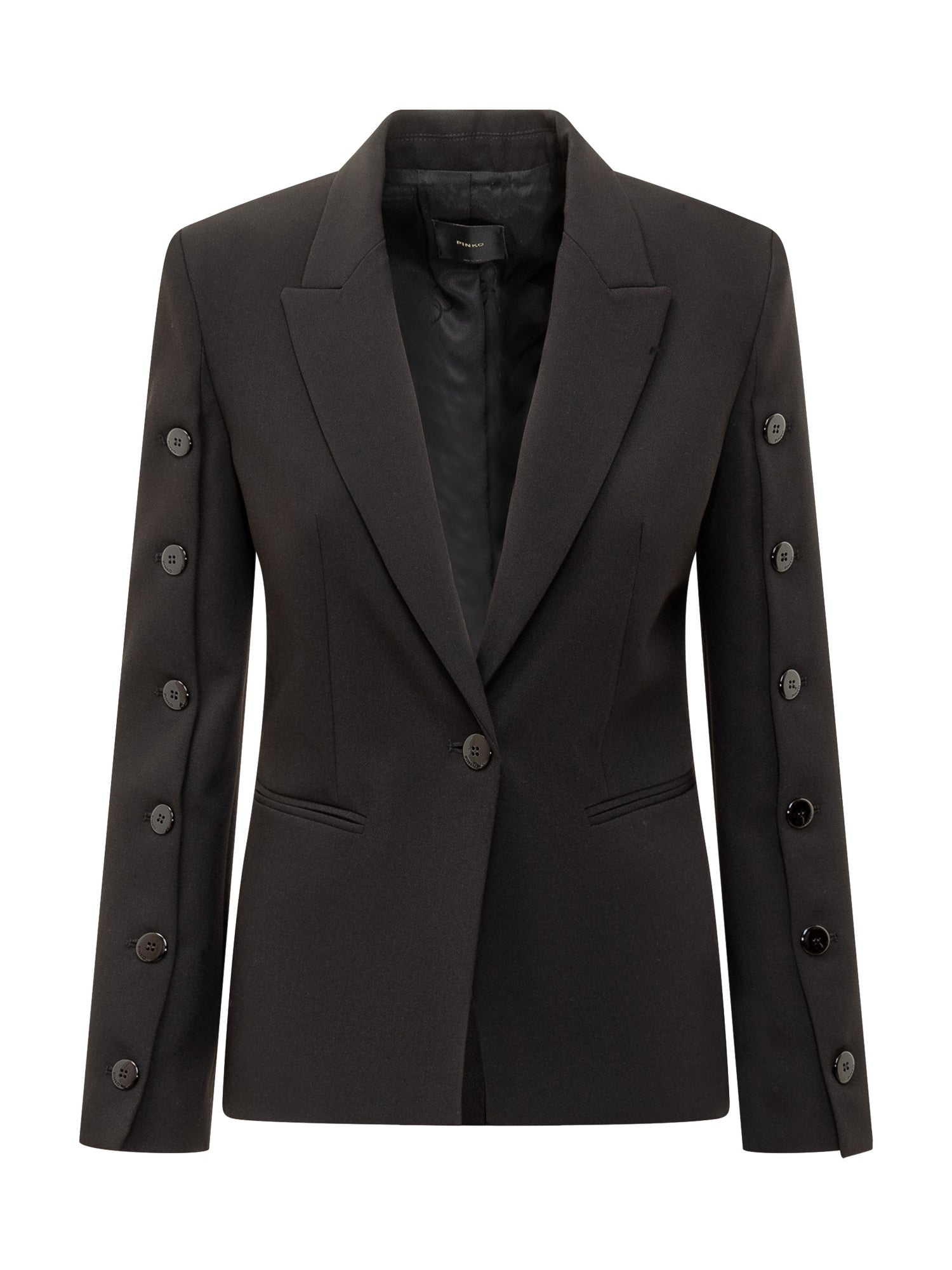 Pinko Garuta blazer in black fabric with a tailored silhouette and single-breasted closure. Long sleeves embellished with button details for a sophisticated and modern touch.