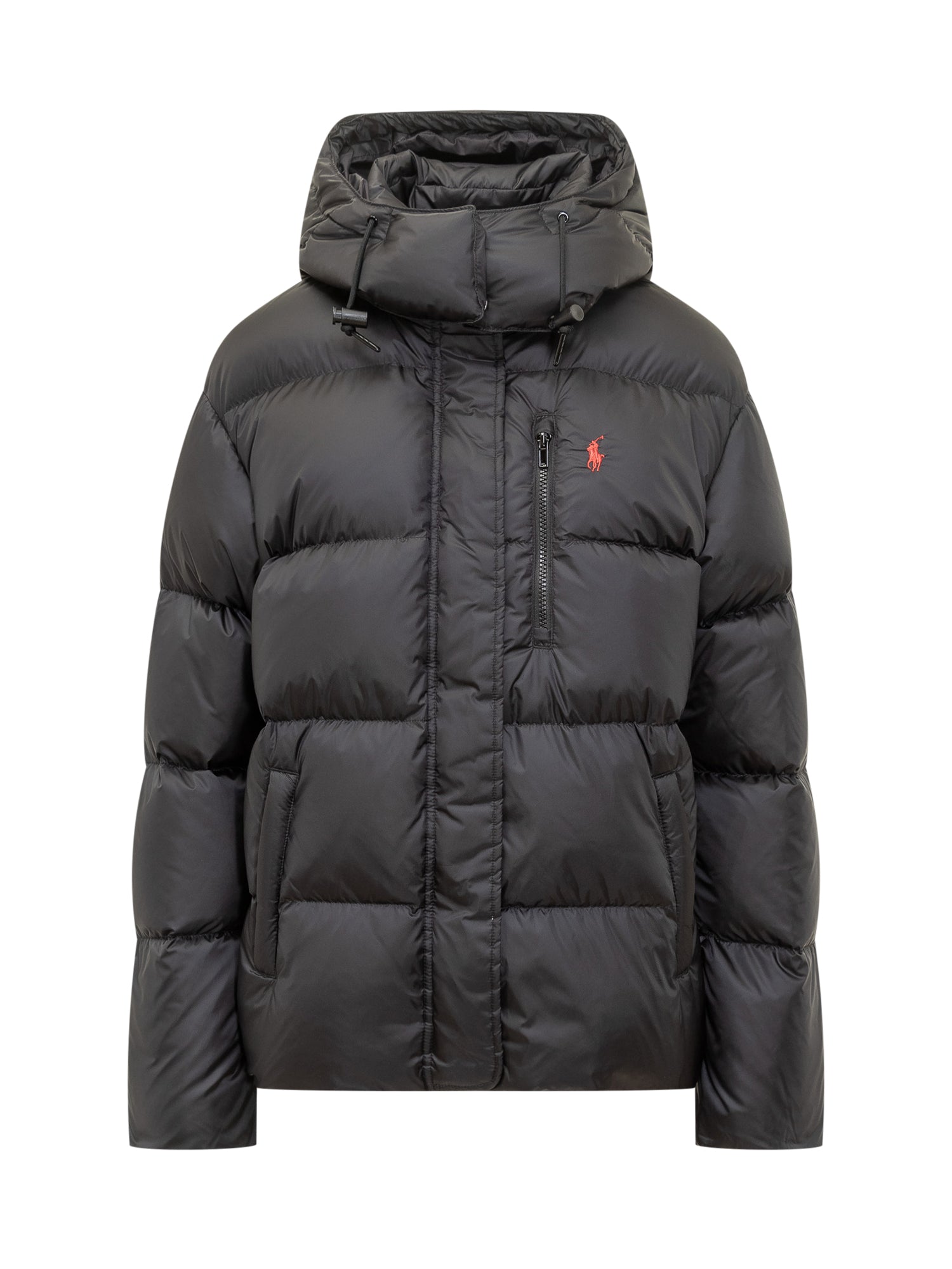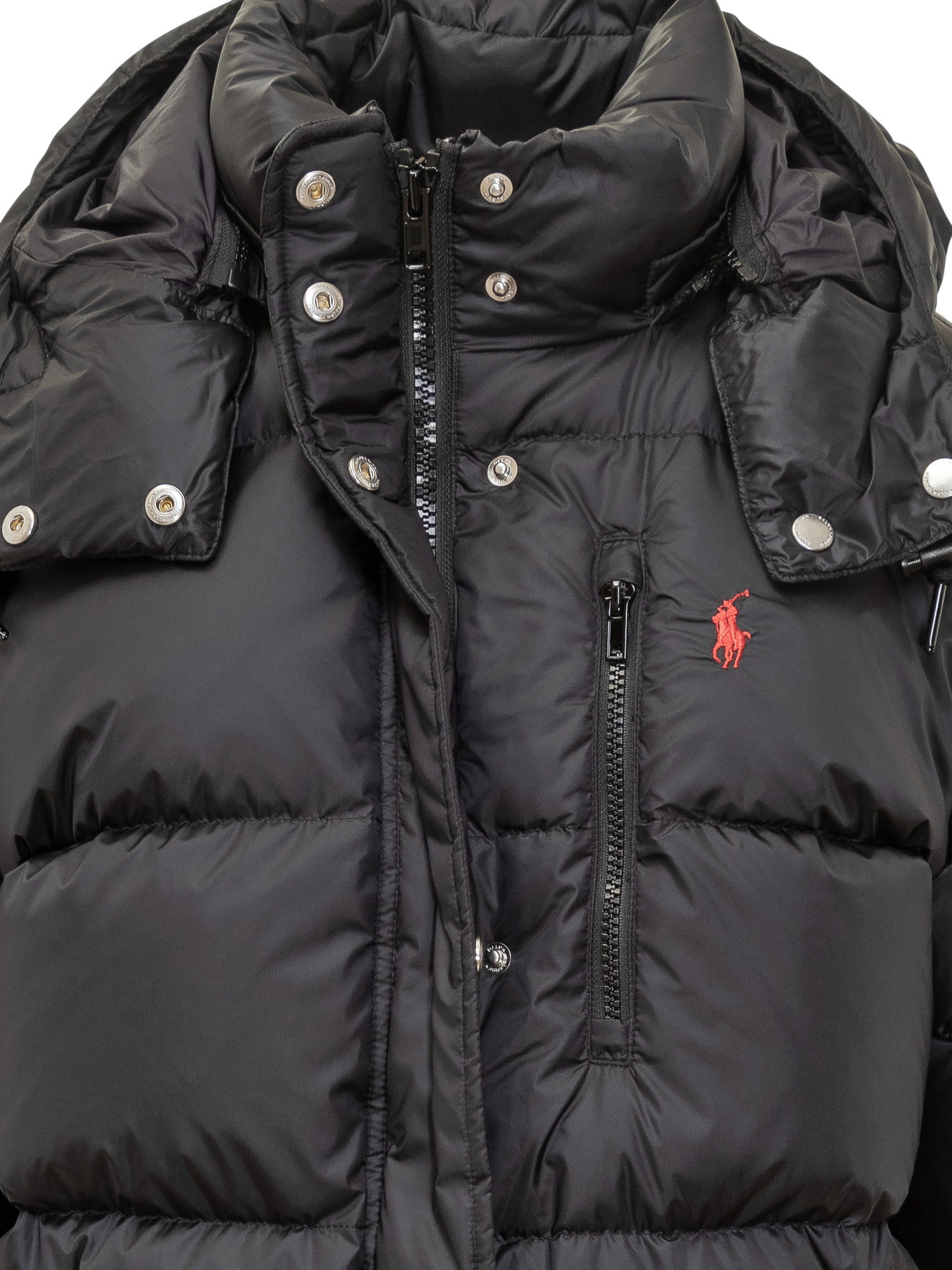 Polo Ralph Lauren black down jacket with adjustable hood, zip closure and contrasting embroidered logo.